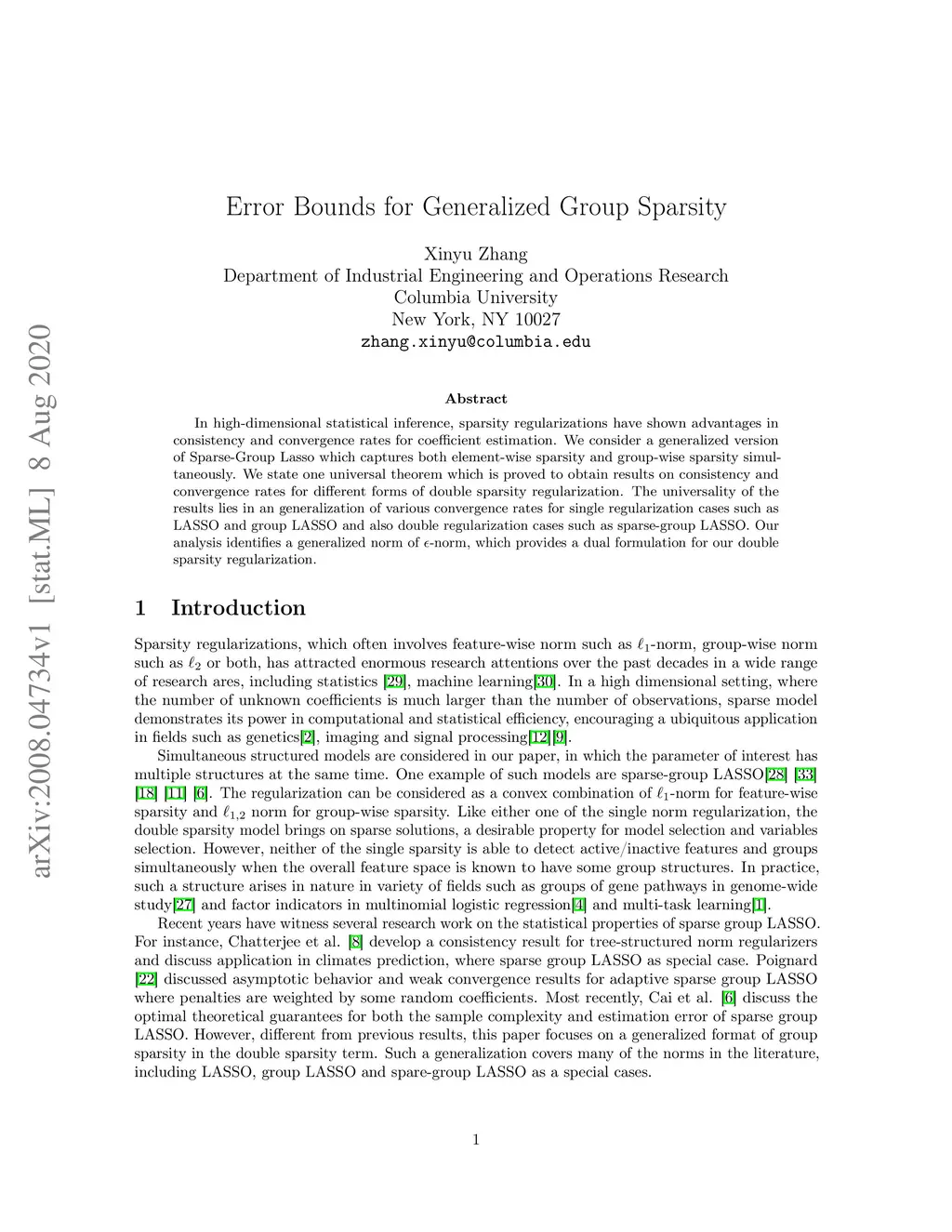 In high-dimensional statistical inference, sparsity regularizations have shown advantages in consistency and convergence rates for coefficient estimation. We consider a generalized version of Sparse-Group Lasso which captures both element-wise sparsity and group-wise sparsity simultaneously. We state one universal theorem which is proved to obtain results on consistency and convergence rates for different forms of double sparsity regularization. The universality of the results lies in an generalization of various convergence rates for single regularization cases such as LASSO and group LASSO and also double regularization cases such as sparse-group LASSO. Our analysis identifies a generalized norm of -norm, which provides a dual formulation for our double sparsity regularization.