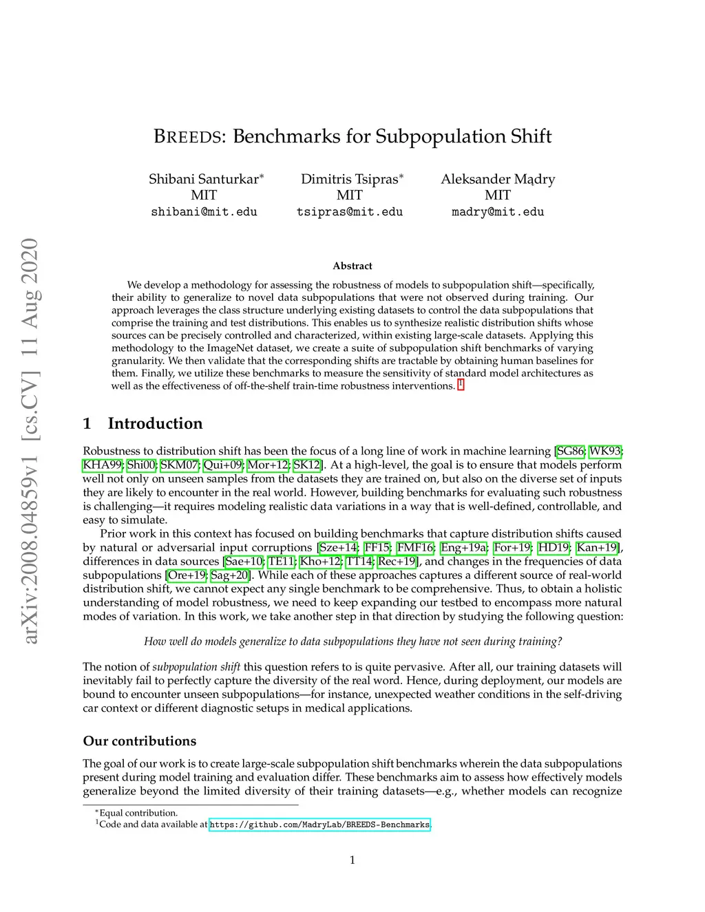 We develop a methodology for assessing the robustness of models to subpopulation shift---specifically, their ability to generalize to novel data subpopulations that were not observed during training. Our approach leverages the class structure underlying existing datasets to control the data subpopulations that comprise the training and test distributions. This enables us to synthesize realistic distribution shifts whose sources can be precisely controlled and characterized, within existing large-scale datasets. Applying this methodology to the ImageNet dataset, we create a suite of subpopulation shift benchmarks of varying granularity. We then validate that the corresponding shifts are tractable by obtaining human baselines for them. Finally, we utilize these benchmarks to measure the sensitivity of standard model architectures as well as the effectiveness of off-the-shelf train-time robustness interventions. Code and data available at https://github.com/MadryLab/BREEDS-Benchmarks .