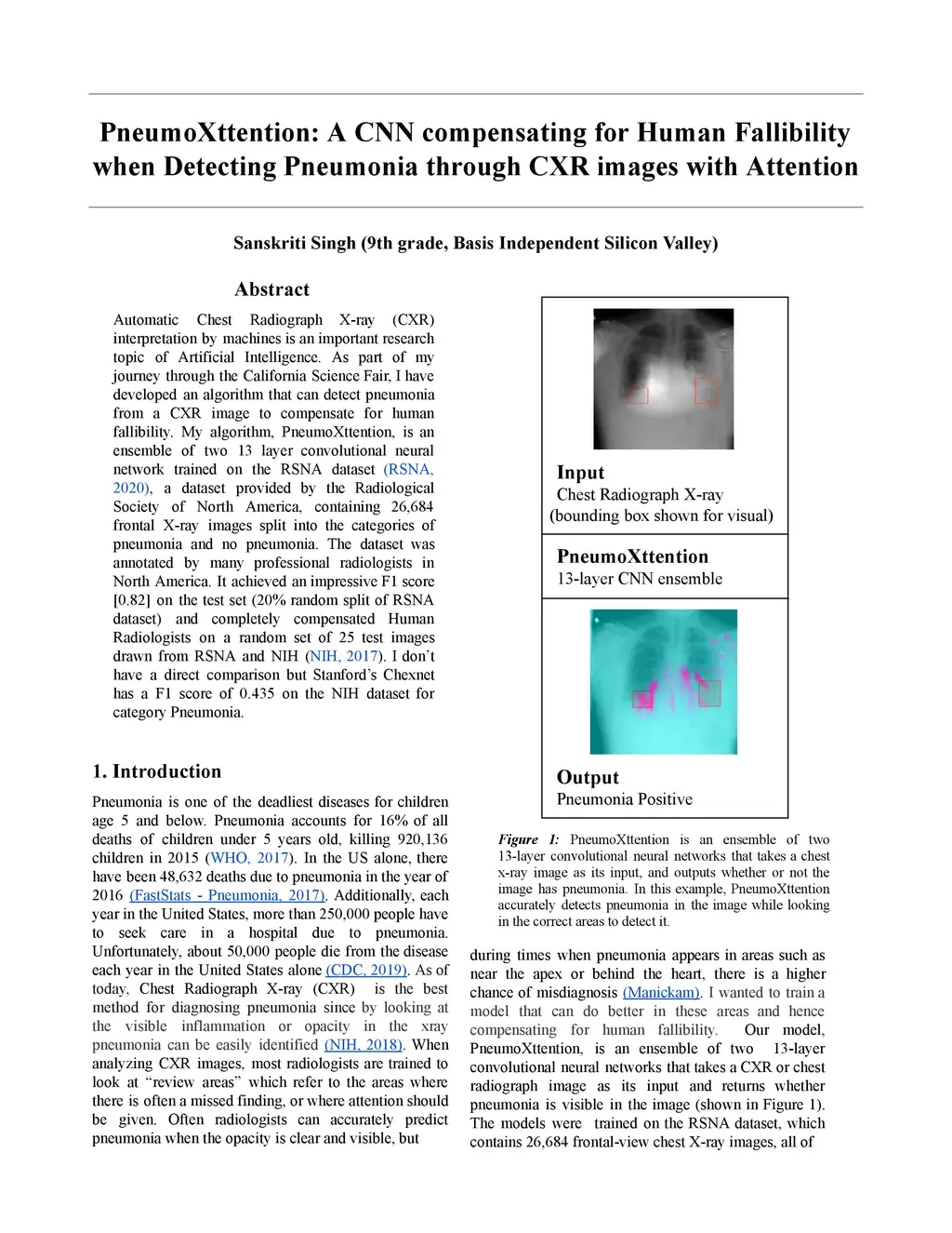Automatic Chest Radiograph X-ray (CXR) interpretation by machines is an important research topic of Artificial Intelligence. As part of my journey through the California Science Fair, I have developed an algorithm that can detect pneumonia from a CXR image to compensate for human fallibility. My algorithm, PneumoXttention, is an ensemble of two 13 layer convolutional neural network trained on the RSNA dataset, a dataset provided by the Radiological Society of North America, containing 26,684 frontal X-ray images split into the categories of pneumonia and no pneumonia. The dataset was annotated by many professional radiologists in North America. It achieved an impressive F1 score, 0.82, on the test set (20% random split of RSNA dataset) and completely compensated Human Radiologists on a random set of 25 test images drawn from RSNA and NIH. I don't have a direct comparison but Stanford's Chexnet has a F1 score of 0.435 on the NIH dataset for category Pneumonia.