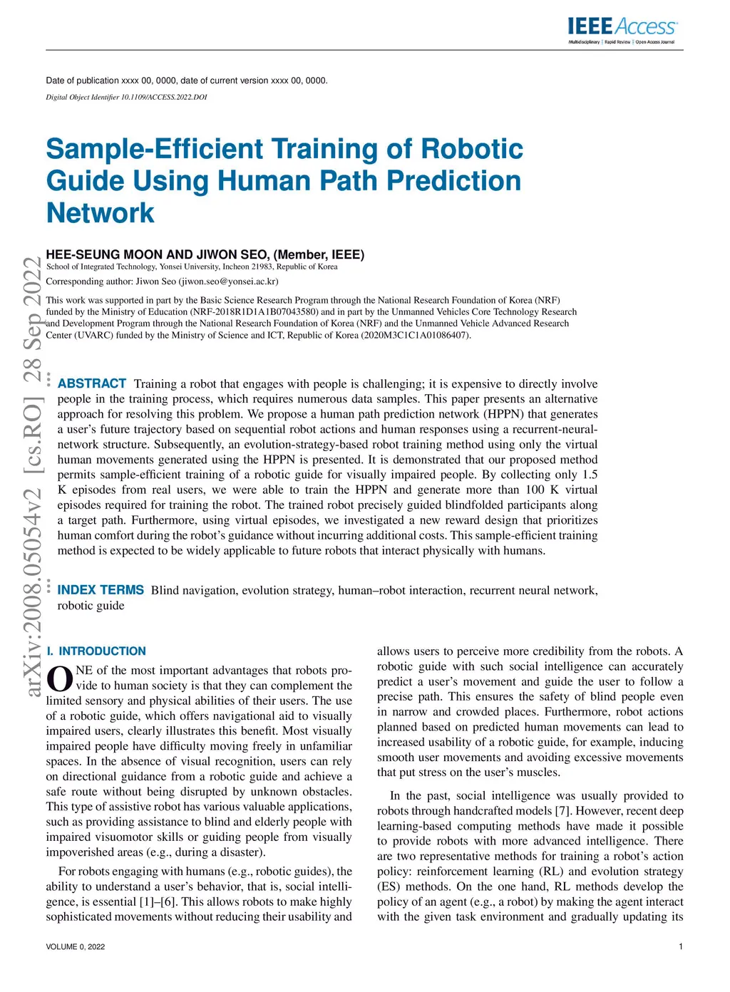 Training a robot that engages with people is challenging; it is expensive to directly involve people in the training process, which requires numerous data samples. This paper presents an alternative approach for resolving this problem. We propose a human path prediction network (HPPN) that generates a user's future trajectory based on sequential robot actions and human responses using a recurrent-neural-network structure. Subsequently, an evolution-strategy-based robot training method using only the virtual human movements generated using the HPPN is presented. It is demonstrated that our proposed method permits sample-efficient training of a robotic guide for visually impaired people. By collecting only 1.5 K episodes from real users, we were able to train the HPPN and generate more than 100 K virtual episodes required for training the robot. The trained robot precisely guided blindfolded participants along a target path. Furthermore, using virtual episodes, we investigated a new reward design that prioritizes human comfort during the robot's guidance without incurring additional costs. This sample-efficient training method is expected to be widely applicable to future robots that interact physically with humans.