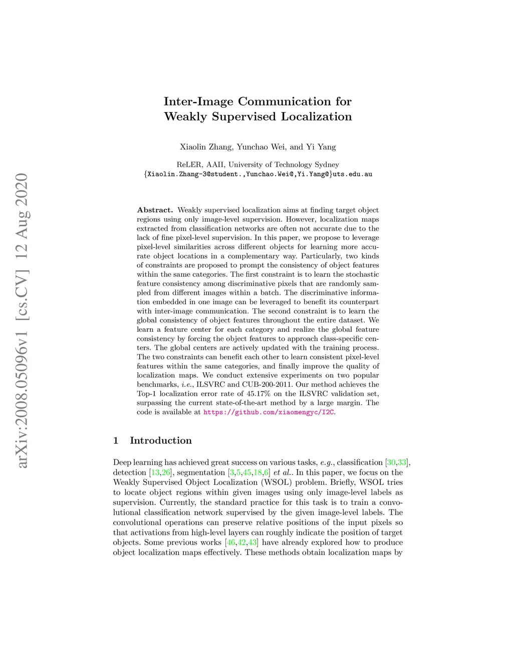 Weakly supervised localization aims at finding target object regions using only image-level supervision. However, localization maps extracted from classification networks are often not accurate due to the lack of fine pixel-level supervision. In this paper, we propose to leverage pixel-level similarities across different objects for learning more accurate object locations in a complementary way. Particularly, two kinds of constraints are proposed to prompt the consistency of object features within the same categories. The first constraint is to learn the stochastic feature consistency among discriminative pixels that are randomly sampled from different images within a batch. The discriminative information embedded in one image can be leveraged to benefit its counterpart with inter-image communication. The second constraint is to learn the global consistency of object features throughout the entire dataset. We learn a feature center for each category and realize the global feature consistency by forcing the object features to approach class-specific centers. The global centers are actively updated with the training process. The two constraints can benefit each other to learn consistent pixel-level features within the same categories, and finally improve the quality of localization maps. We conduct extensive experiments on two popular benchmarks, i.e., ILSVRC and CUB-200-2011. Our method achieves the Top-1 localization error rate of 45.17% on the ILSVRC validation set, surpassing the current state-of-the-art method by a large margin. The code is available at https://github.com/xiaomengyc/I2C.