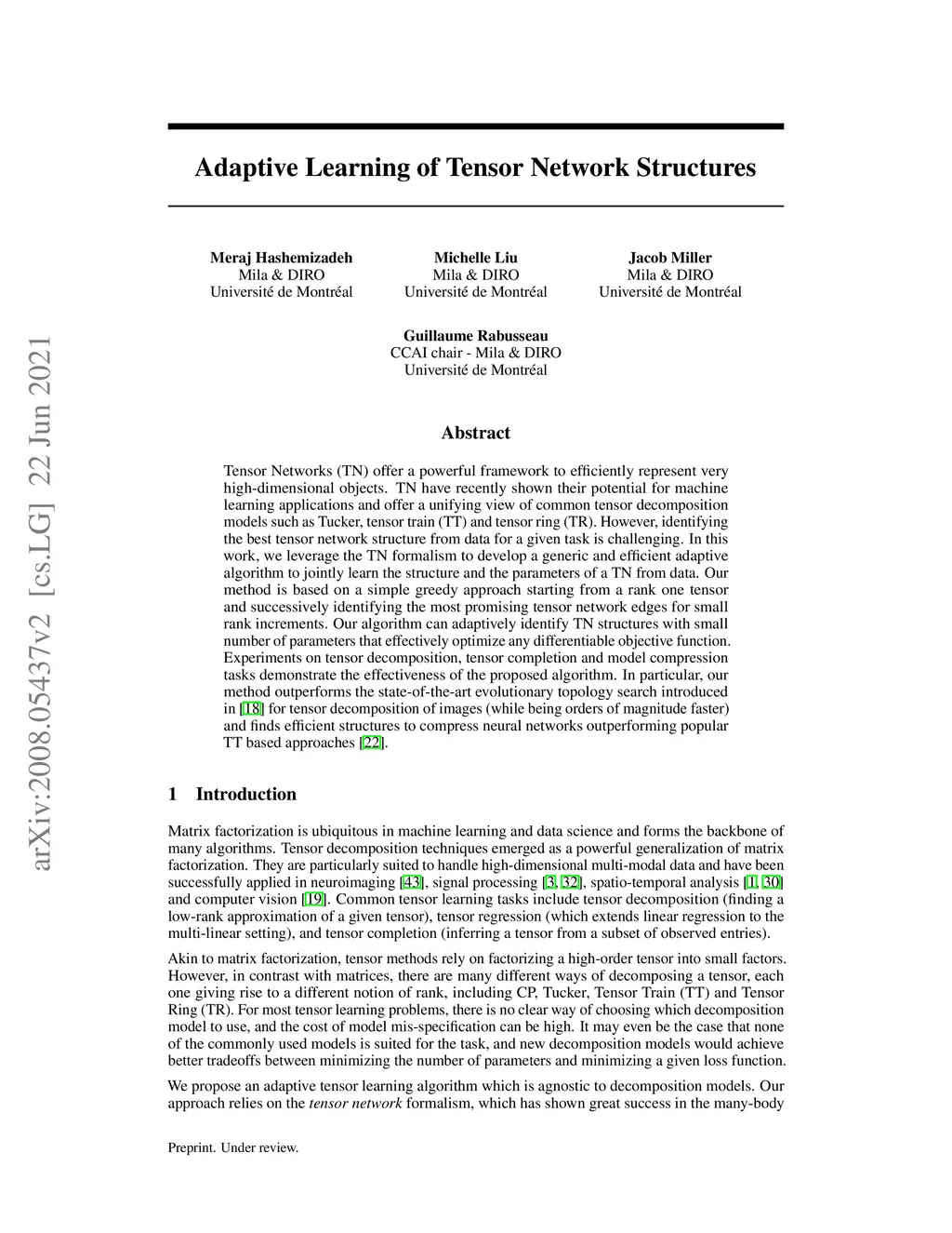 Tensor Networks (TN) offer a powerful framework to efficiently represent very high-dimensional objects. TN have recently shown their potential for machine learning applications and offer a unifying view of common tensor decomposition models such as Tucker, tensor train (TT) and tensor ring (TR). However, identifying the best tensor network structure from data for a given task is challenging. In this work, we leverage the TN formalism to develop a generic and efficient adaptive algorithm to jointly learn the structure and the parameters of a TN from data. Our method is based on a simple greedy approach starting from a rank one tensor and successively identifying the most promising tensor network edges for small rank increments. Our algorithm can adaptively identify TN structures with small number of parameters that effectively optimize any differentiable objective function. Experiments on tensor decomposition, tensor completion and model compression tasks demonstrate the effectiveness of the proposed algorithm. In particular, our method outperforms the state-of-the-art evolutionary topology search [Li and Sun, 2020] for tensor decomposition of images (while being orders of magnitude faster) and finds efficient tensor network structures to compress neural networks outperforming popular TT based approaches [Novikov et al., 2015].