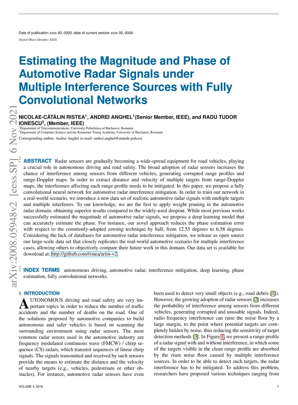Radar sensors are gradually becoming a wide-spread equipment for road vehicles, playing a crucial role in autonomous driving and road safety. The broad adoption of radar sensors increases the chance of interference among sensors from different vehicles, generating corrupted range profiles and range-Doppler maps. In order to extract distance and velocity of multiple targets from range-Doppler maps, the interference affecting each range profile needs to be mitigated. In this paper, we propose a fully convolutional neural network for automotive radar interference mitigation. In order to train our network in a real-world scenario, we introduce a new data set of realistic automotive radar signals with multiple targets and multiple interferers. To our knowledge, we are the first to apply weight pruning in the automotive radar domain, obtaining superior results compared to the widely-used dropout. While most previous works successfully estimated the magnitude of automotive radar signals, we propose a deep learning model that can accurately estimate the phase. For instance, our novel approach reduces the phase estimation error with respect to the commonly-adopted zeroing technique by half, from 12.55 degrees to 6.58 degrees. Considering the lack of databases for automotive radar interference mitigation, we release as open source our large-scale data set that closely replicates the real-world automotive scenario for multiple interference cases, allowing others to objectively compare their future work in this domain. Our data set is available for download at: http://github.com/ristea/arim-v2.
