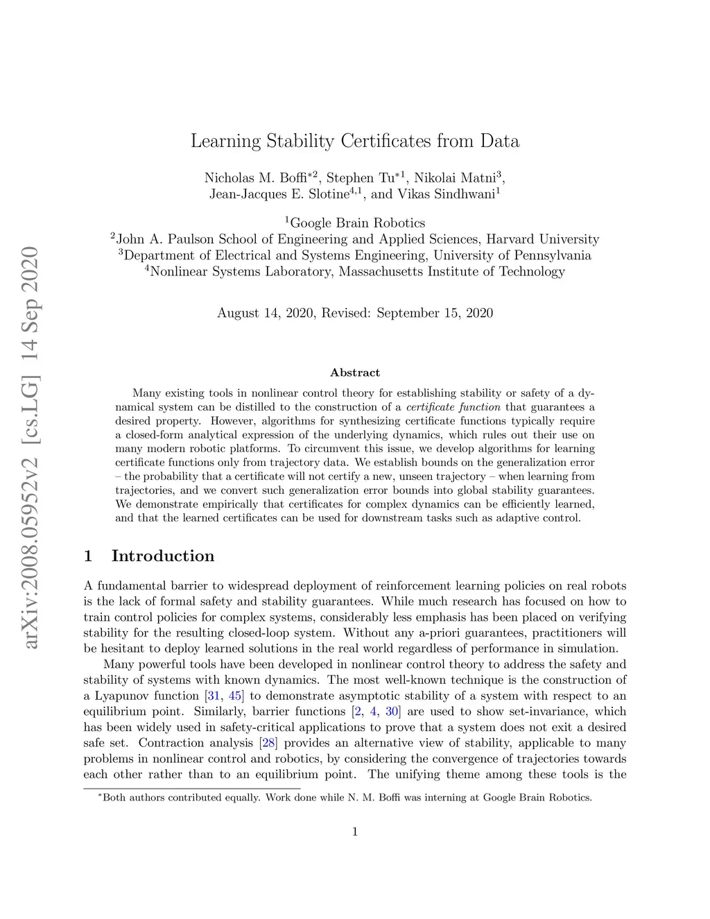 Many existing tools in nonlinear control theory for establishing stability or safety of a dynamical system can be distilled to the construction of a certificate function that guarantees a desired property. However, algorithms for synthesizing certificate functions typically require a closed-form analytical expression of the underlying dynamics, which rules out their use on many modern robotic platforms. To circumvent this issue, we develop algorithms for learning certificate functions only from trajectory data. We establish bounds on the generalization error - the probability that a certificate will not certify a new, unseen trajectory - when learning from trajectories, and we convert such generalization error bounds into global stability guarantees. We demonstrate empirically that certificates for complex dynamics can be efficiently learned, and that the learned certificates can be used for downstream tasks such as adaptive control.