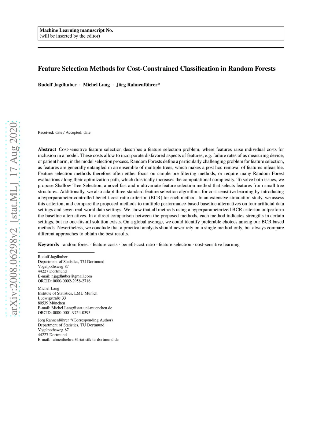 Cost-sensitive feature selection describes a feature selection problem, where features raise individual costs for inclusion in a model. These costs allow to incorporate disfavored aspects of features, e.g. failure rates of as measuring device, or patient harm, in the model selection process. Random Forests define a particularly challenging problem for feature selection, as features are generally entangled in an ensemble of multiple trees, which makes a post hoc removal of features infeasible. Feature selection methods therefore often either focus on simple pre-filtering methods, or require many Random Forest evaluations along their optimization path, which drastically increases the computational complexity. To solve both issues, we propose Shallow Tree Selection, a novel fast and multivariate feature selection method that selects features from small tree structures. Additionally, we also adapt three standard feature selection algorithms for cost-sensitive learning by introducing a hyperparameter-controlled benefit-cost ratio criterion (BCR) for each method. In an extensive simulation study, we assess this criterion, and compare the proposed methods to multiple performance-based baseline alternatives on four artificial data settings and seven real-world data settings. We show that all methods using a hyperparameterized BCR criterion outperform the baseline alternatives. In a direct comparison between the proposed methods, each method indicates strengths in certain settings, but no one-fits-all solution exists. On a global average, we could identify preferable choices among our BCR based methods. Nevertheless, we conclude that a practical analysis should never rely on a single method only, but always compare different approaches to obtain the best results.