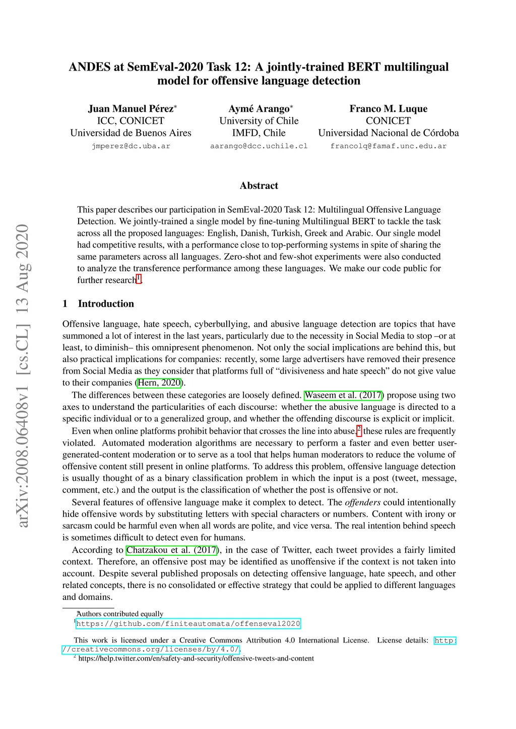 ANDES at SemEval-2020 Task 12: A jointly-trained BERT multilingual model