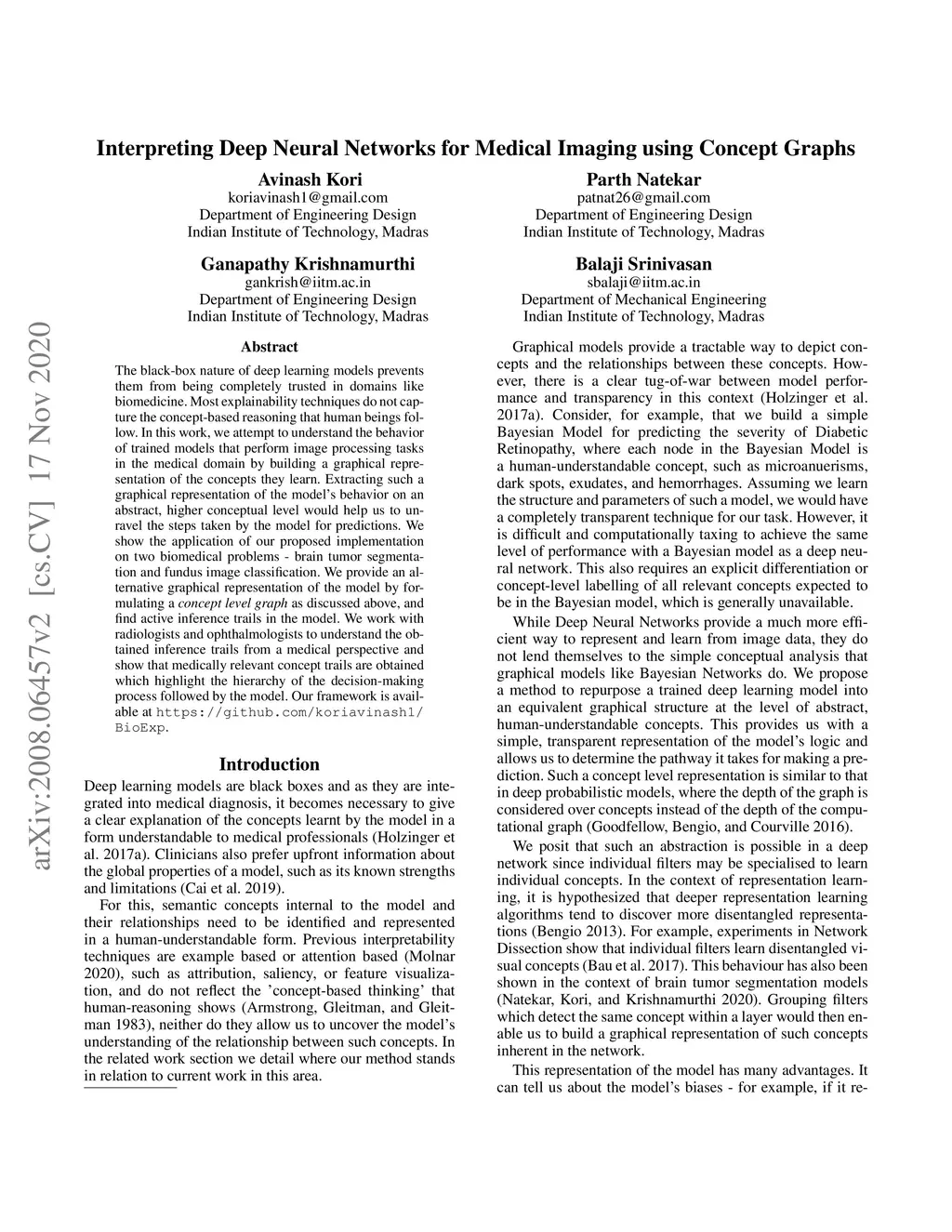 The black-box nature of deep learning models prevents them from being completely trusted in domains like biomedicine. Most explainability techniques do not capture the concept-based reasoning that human beings follow. In this work, we attempt to understand the behavior of trained models that perform image processing tasks in the medical domain by building a graphical representation of the concepts they learn. Extracting such a graphical representation of the model's behavior on an abstract, higher conceptual level would unravel the learnings of these models and would help us to evaluate the steps taken by the model for predictions. We show the application of our proposed implementation on two biomedical problems - brain tumor segmentation and fundus image classification. We provide an alternative graphical representation of the model by formulating a concept level graph as discussed above, which makes the problem of intervention to find active inference trails more tractable. Understanding these trails would provide an understanding of the hierarchy of the decision-making process followed by the model. [As well as overall nature of model]. Our framework is available at https://github.com/koriavinash1/BioExp