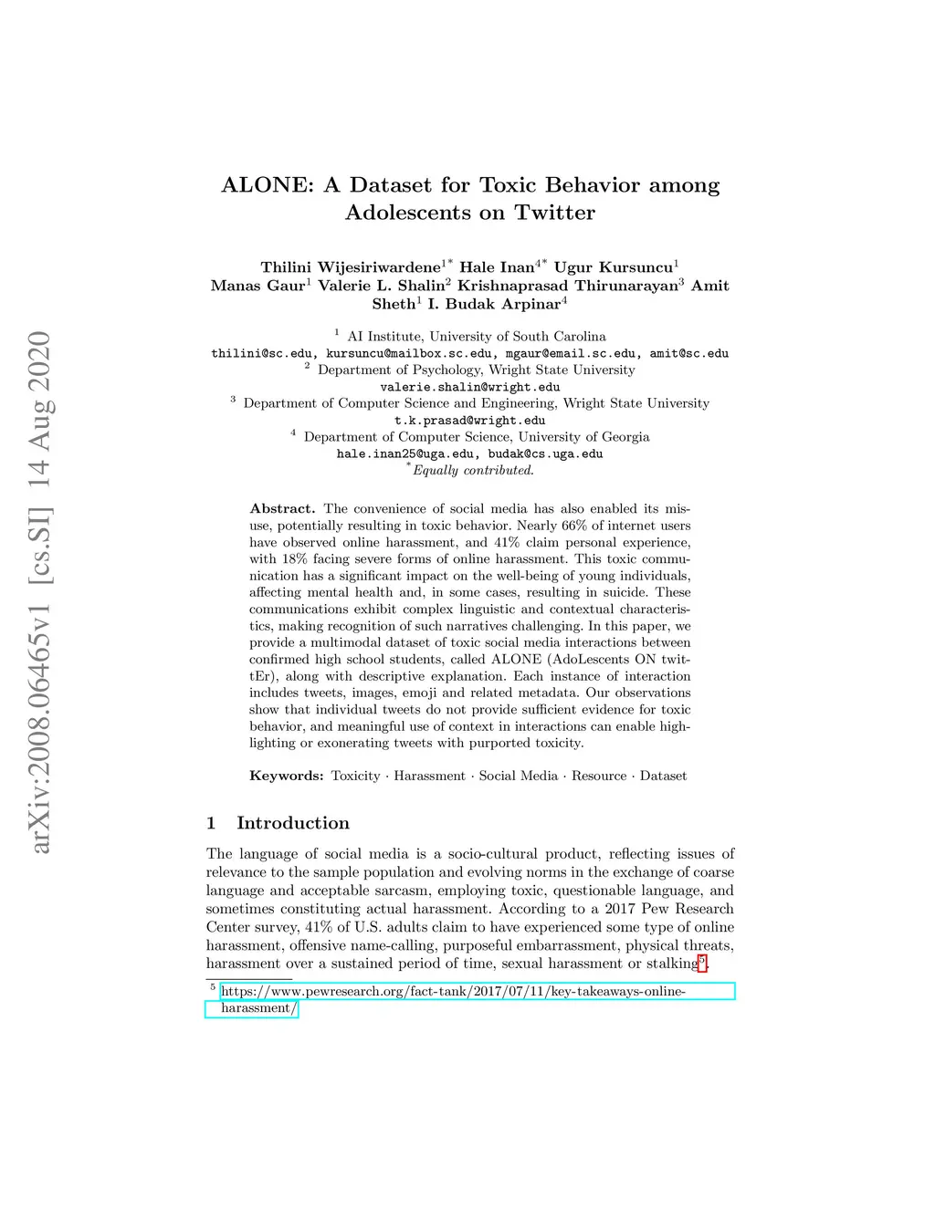 ALONE: A Dataset for Toxic Behavior among Adolescents on Twitter