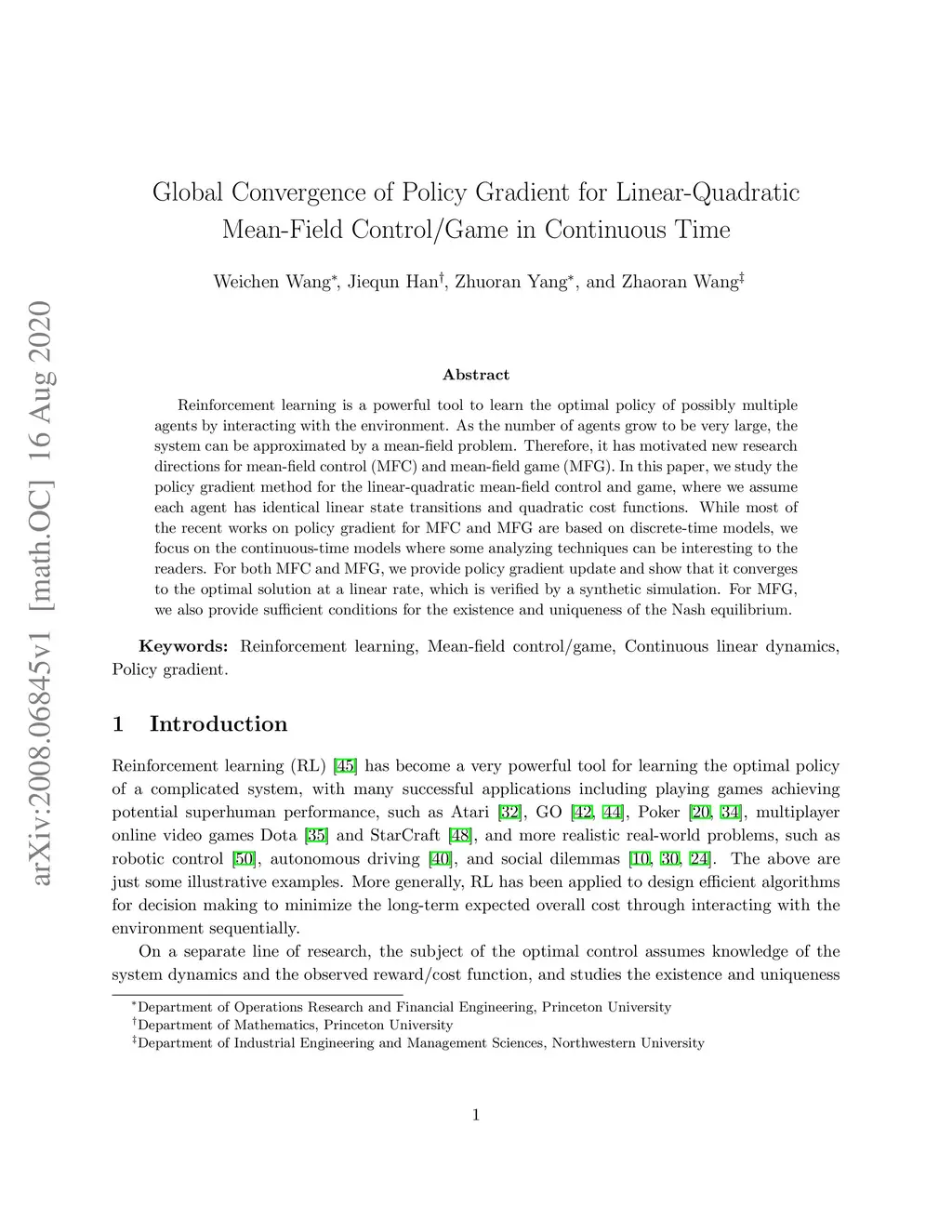 Reinforcement learning is a powerful tool to learn the optimal policy of possibly multiple agents by interacting with the environment. As the number of agents grow to be very large, the system can be approximated by a mean-field problem. Therefore, it has motivated new research directions for mean-field control (MFC) and mean-field game (MFG). In this paper, we study the policy gradient method for the linear-quadratic mean-field control and game, where we assume each agent has identical linear state transitions and quadratic cost functions. While most of the recent works on policy gradient for MFC and MFG are based on discrete-time models, we focus on the continuous-time models where some analyzing techniques can be interesting to the readers. For both MFC and MFG, we provide policy gradient update and show that it converges to the optimal solution at a linear rate, which is verified by a synthetic simulation. For MFG, we also provide sufficient conditions for the existence and uniqueness of the Nash equilibrium.