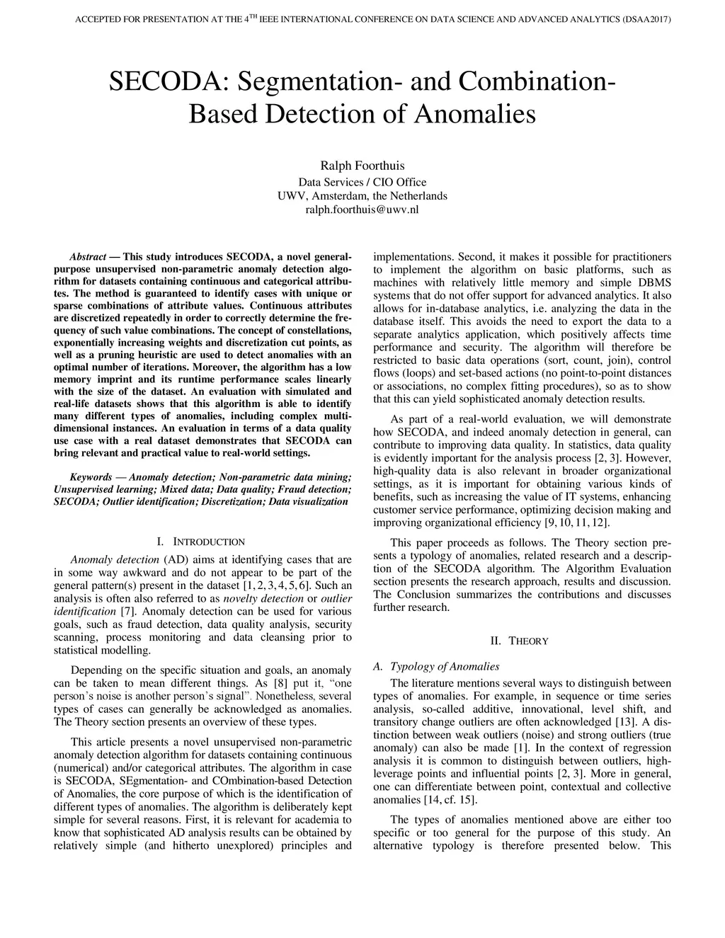 This study introduces SECODA, a novel general-purpose unsupervised non-parametric anomaly detection algorithm for datasets containing continuous and categorical attributes. The method is guaranteed to identify cases with unique or sparse combinations of attribute values. Continuous attributes are discretized repeatedly in order to correctly determine the frequency of such value combinations. The concept of constellations, exponentially increasing weights and discretization cut points, as well as a pruning heuristic are used to detect anomalies with an optimal number of iterations. Moreover, the algorithm has a low memory imprint and its runtime performance scales linearly with the size of the dataset. An evaluation with simulated and real-life datasets shows that this algorithm is able to identify many different types of anomalies, including complex multidimensional instances. An evaluation in terms of a data quality use case with a real dataset demonstrates that SECODA can bring relevant and practical value to real-world settings.
