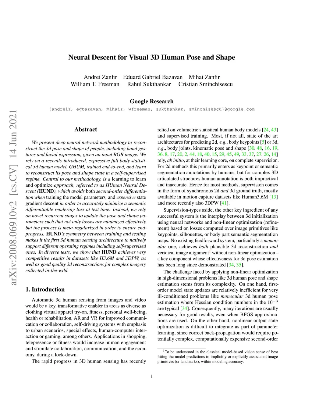 We present deep neural network methodology to reconstruct the 3d pose and shape of people, given an input RGB image. We rely on a recently introduced, expressivefull body statistical 3d human model, GHUM, trained end-to-end, and learn to reconstruct its pose and shape state in a self-supervised regime. Central to our methodology, is a learning to learn and optimize approach, referred to as HUmanNeural Descent (HUND), which avoids both second-order differentiation when training the model parameters,and expensive state gradient descent in order to accurately minimize a semantic differentiable rendering loss at test time. Instead, we rely on novel recurrent stages to update the pose and shape parameters such that not only losses are minimized effectively, but the process is meta-regularized in order to ensure end-progress. HUND's symmetry between training and testing makes it the first 3d human sensing architecture to natively support different operating regimes including self-supervised ones. In diverse tests, we show that HUND achieves very competitive results in datasets like H3.6M and 3DPW, aswell as good quality 3d reconstructions for complex imagery collected in-the-wild.