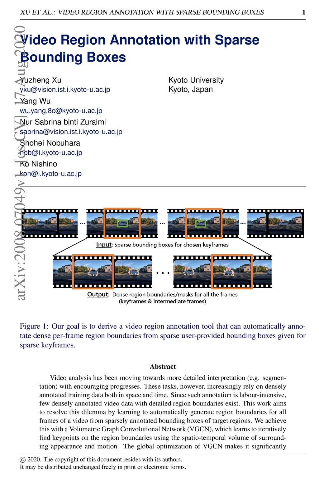 Video analysis has been moving towards more detailed interpretation (e.g. segmentation) with encouraging progresses. These tasks, however, increasingly rely on densely annotated training data both in space and time. Since such annotation is labour-intensive, few densely annotated video data with detailed region boundaries exist. This work aims to resolve this dilemma by learning to automatically generate region boundaries for all frames of a video from sparsely annotated bounding boxes of target regions. We achieve this with a Volumetric Graph Convolutional Network (VGCN), which learns to iteratively find keypoints on the region boundaries using the spatio-temporal volume of surrounding appearance and motion. The global optimization of VGCN makes it significantly stronger and generalize better than existing solutions. Experimental results using two latest datasets (one real and one synthetic), including ablation studies, demonstrate the effectiveness and superiority of our method.