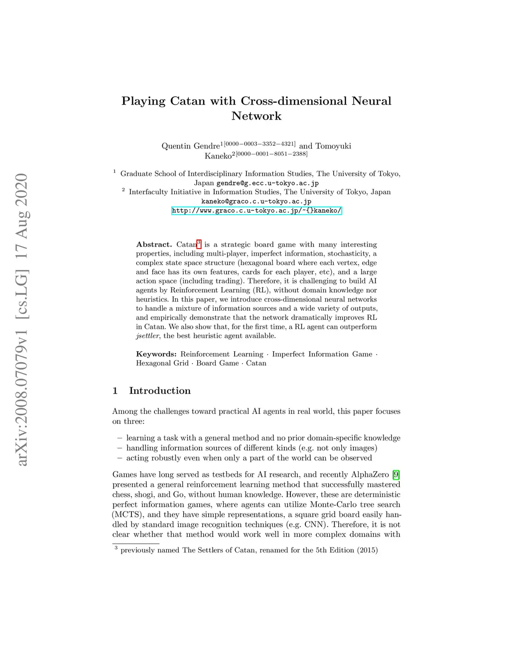 Catan is a strategic board game having interesting properties, including multi-player, imperfect information, stochastic, complex state space structure (hexagonal board where each vertex, edge and face has its own features, cards for each player, etc), and a large action space (including negotiation). Therefore, it is challenging to build AI agents by Reinforcement Learning (RL for short), without domain knowledge nor heuristics. In this paper, we introduce cross-dimensional neural networks to handle a mixture of information sources and a wide variety of outputs, and empirically demonstrate that the network dramatically improves RL in Catan. We also show that, for the first time, a RL agent can outperform jsettler, the best heuristic agent available.