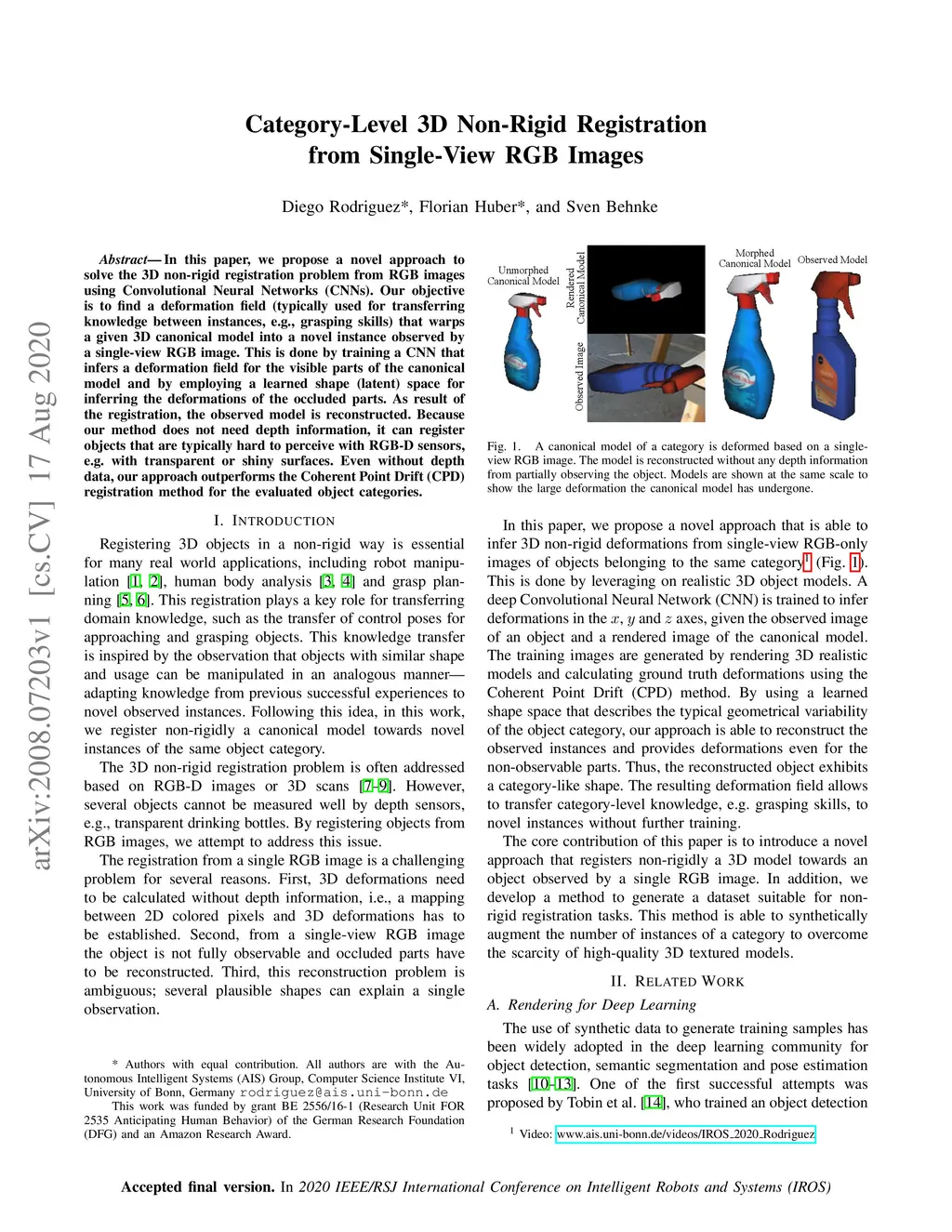 In this paper, we propose a novel approach to solve the 3D non-rigid registration problem from RGB images using Convolutional Neural Networks (CNNs). Our objective is to find a deformation field (typically used for transferring knowledge between instances, e.g., grasping skills) that warps a given 3D canonical model into a novel instance observed by a single-view RGB image. This is done by training a CNN that infers a deformation field for the visible parts of the canonical model and by employing a learned shape (latent) space for inferring the deformations of the occluded parts. As result of the registration, the observed model is reconstructed. Because our method does not need depth information, it can register objects that are typically hard to perceive with RGB-D sensors, e.g. with transparent or shiny surfaces. Even without depth data, our approach outperforms the Coherent Point Drift (CPD) registration method for the evaluated object categories.