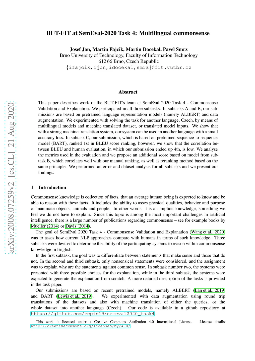 This paper describes work of the BUT-FIT's team at SemEval 2020 Task 4 - Commonsense Validation and Explanation. We participated in all three subtasks. In subtasks A and B, our submissions are based on pretrained language representation models (namely ALBERT) and data augmentation. We experimented with solving the task for another language, Czech, by means of multilingual models and machine translated dataset, or translated model inputs. We show that with a strong machine translation system, our system can be used in another language with a small accuracy loss. In subtask C, our submission, which is based on pretrained sequence-to-sequence model (BART), ranked 1st in BLEU score ranking, however, we show that the correlation between BLEU and human evaluation, in which our submission ended up 4th, is low. We analyse the metrics used in the evaluation and we propose an additional score based on model from subtask B, which correlates well with our manual ranking, as well as reranking method based on the same principle. We performed an error and dataset analysis for all subtasks and we present our findings.