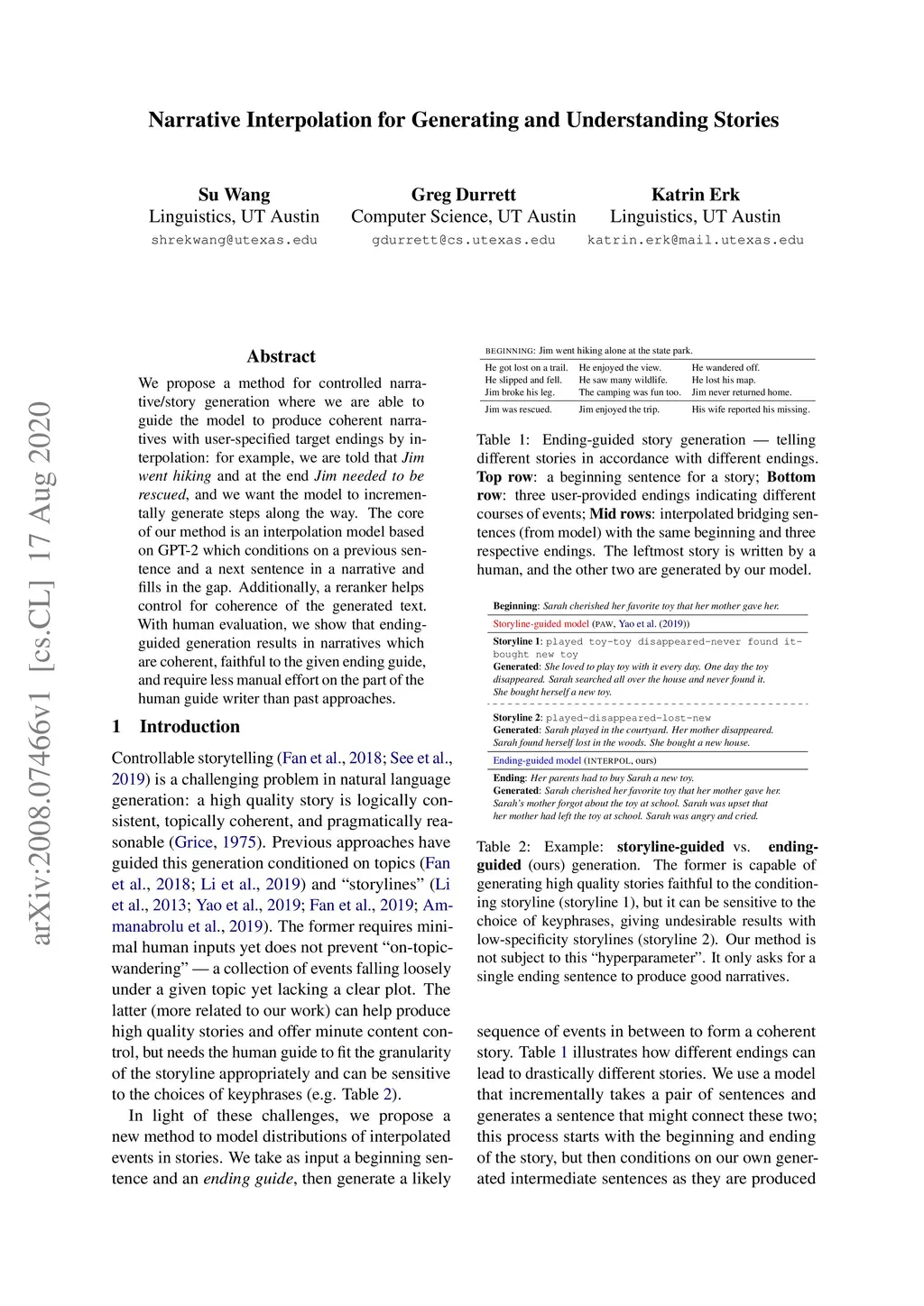 We propose a method for controlled narrative/story generation where we are able to guide the model to produce coherent narratives with user-specified target endings by interpolation: for example, we are told that Jim went hiking and at the end Jim needed to be rescued, and we want the model to incrementally generate steps along the way. The core of our method is an interpolation model based on GPT-2 which conditions on a previous sentence and a next sentence in a narrative and fills in the gap. Additionally, a reranker helps control for coherence of the generated text. With human evaluation, we show that ending-guided generation results in narratives which are coherent, faithful to the given ending guide, and require less manual effort on the part of the human guide writer than past approaches.