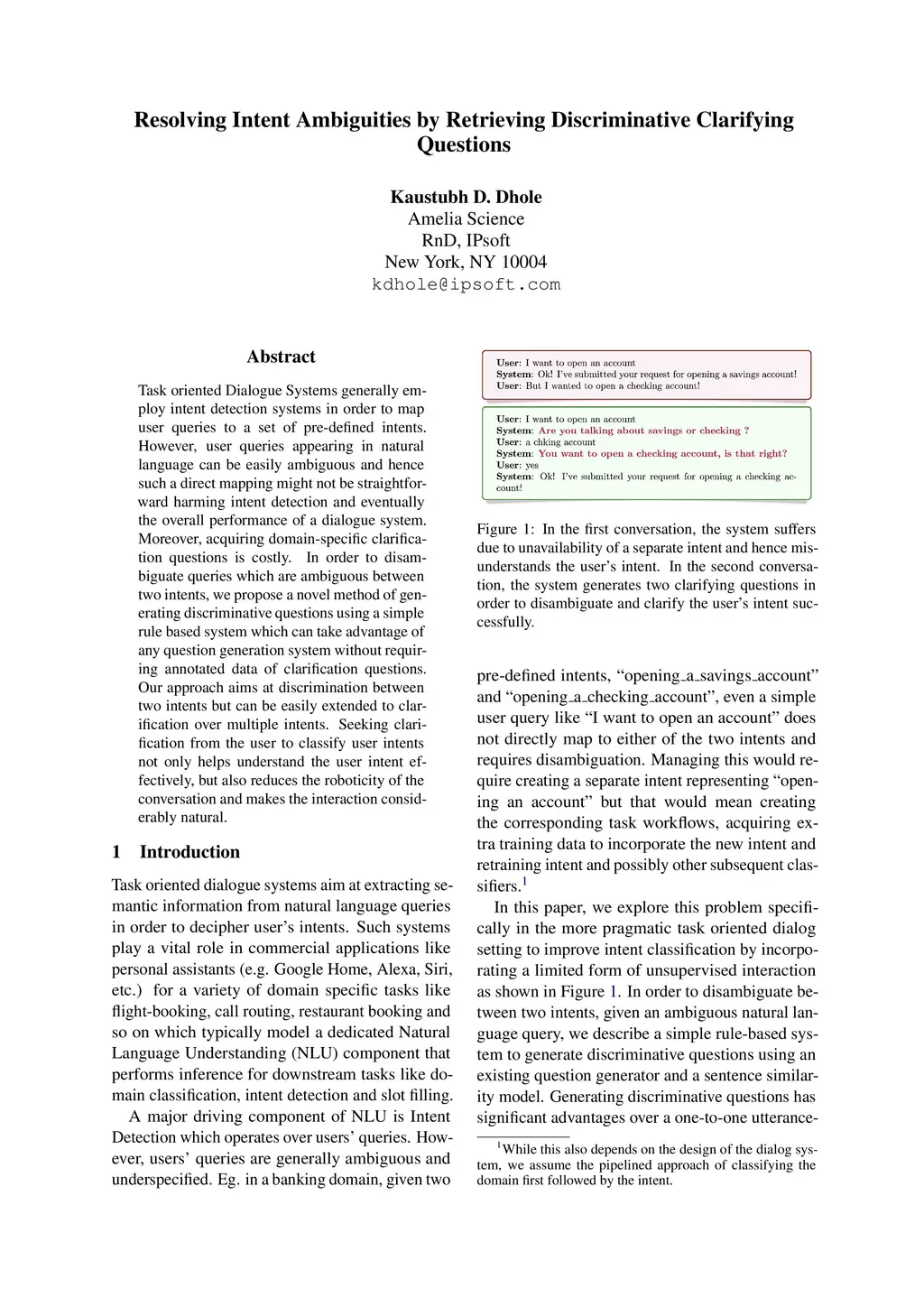 Task oriented Dialogue Systems generally employ intent detection systems in order to map user queries to a set of pre-defined intents. However, user queries appearing in natural language can be easily ambiguous and hence such a direct mapping might not be straightforward harming intent detection and eventually the overall performance of a dialogue system. Moreover, acquiring domain-specific clarification questions is costly. In order to disambiguate queries which are ambiguous between two intents, we propose a novel method of generating discriminative questions using a simple rule based system which can take advantage of any question generation system without requiring annotated data of clarification questions. Our approach aims at discrimination between two intents but can be easily extended to clarification over multiple intents. Seeking clarification from the user to classify user intents not only helps understand the user intent effectively, but also reduces the roboticity of the conversation and makes the interaction considerably natural.