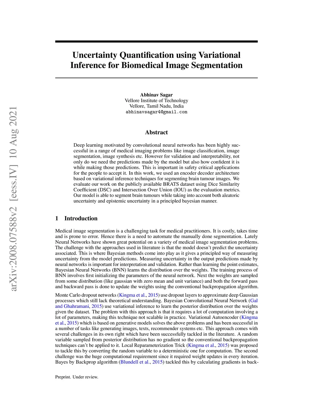 Deep learning motivated by convolutional neural networks has been highly successful in a range of medical imaging problems like image classification, image segmentation, image synthesis etc. However for validation and interpretability, not only do we need the predictions made by the model but also how confident it is while making those predictions. This is important in safety critical applications for the people to accept it. In this work, we used an encoder decoder architecture based on variational inference techniques for segmenting brain tumour images. We evaluate our work on the publicly available BRATS dataset using Dice Similarity Coefficient (DSC) and Intersection Over Union (IOU) as the evaluation metrics. Our model is able to segment brain tumours while taking into account both aleatoric uncertainty and epistemic uncertainty in a principled bayesian manner.