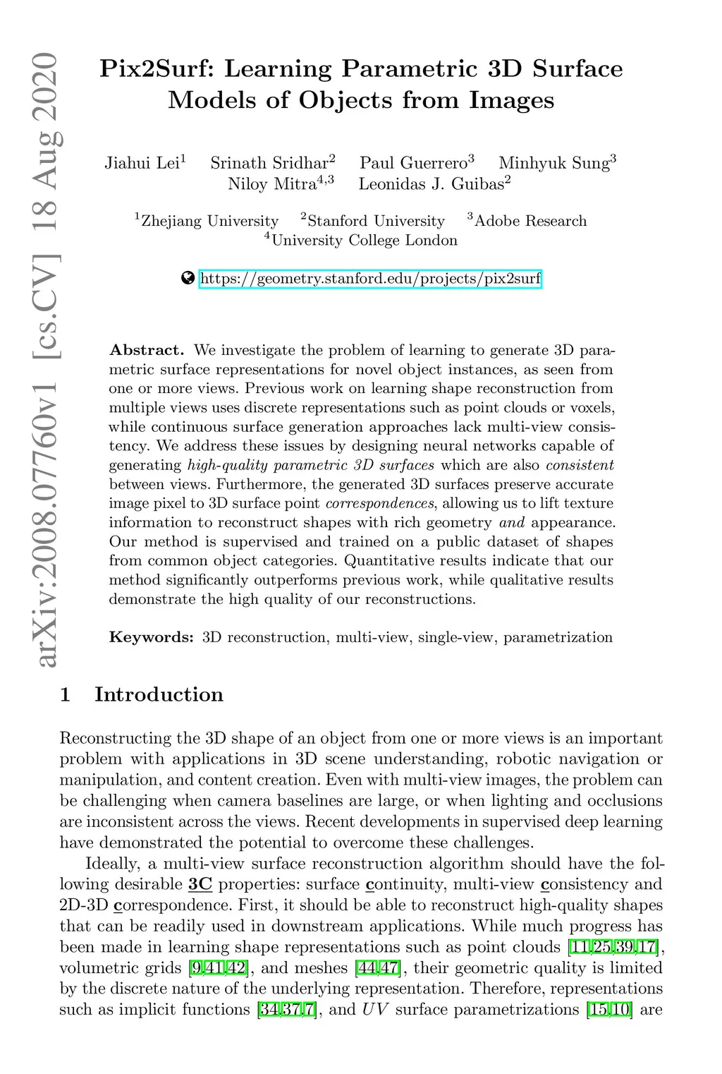 We investigate the problem of learning to generate 3D parametric surface representations for novel object instances, as seen from one or more views. Previous work on learning shape reconstruction from multiple views uses discrete representations such as point clouds or voxels, while continuous surface generation approaches lack multi-view consistency. We address these issues by designing neural networks capable of generating high-quality parametric 3D surfaces which are also consistent between views. Furthermore, the generated 3D surfaces preserve accurate image pixel to 3D surface point correspondences, allowing us to lift texture information to reconstruct shapes with rich geometry and appearance. Our method is supervised and trained on a public dataset of shapes from common object categories. Quantitative results indicate that our method significantly outperforms previous work, while qualitative results demonstrate the high quality of our reconstructions.