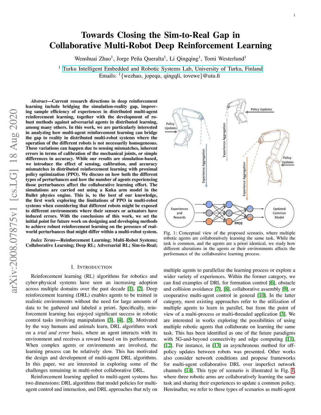 Current research directions in deep reinforcement learning include bridging the simulation-reality gap, improving sample efficiency of experiences in distributed multi-agent reinforcement learning, together with the development of robust methods against adversarial agents in distributed learning, among many others. In this work, we are particularly interested in analyzing how multi-agent reinforcement learning can bridge the gap to reality in distributed multi-robot systems where the operation of the different robots is not necessarily homogeneous. These variations can happen due to sensing mismatches, inherent errors in terms of calibration of the mechanical joints, or simple differences in accuracy. While our results are simulation-based, we introduce the effect of sensing, calibration, and accuracy mismatches in distributed reinforcement learning with proximal policy optimization (PPO). We discuss on how both the different types of perturbances and how the number of agents experiencing those perturbances affect the collaborative learning effort. The simulations are carried out using a Kuka arm model in the Bullet physics engine. This is, to the best of our knowledge, the first work exploring the limitations of PPO in multi-robot systems when considering that different robots might be exposed to different environments where their sensors or actuators have induced errors. With the conclusions of this work, we set the initial point for future work on designing and developing methods to achieve robust reinforcement learning on the presence of real-world perturbances that might differ within a multi-robot system.