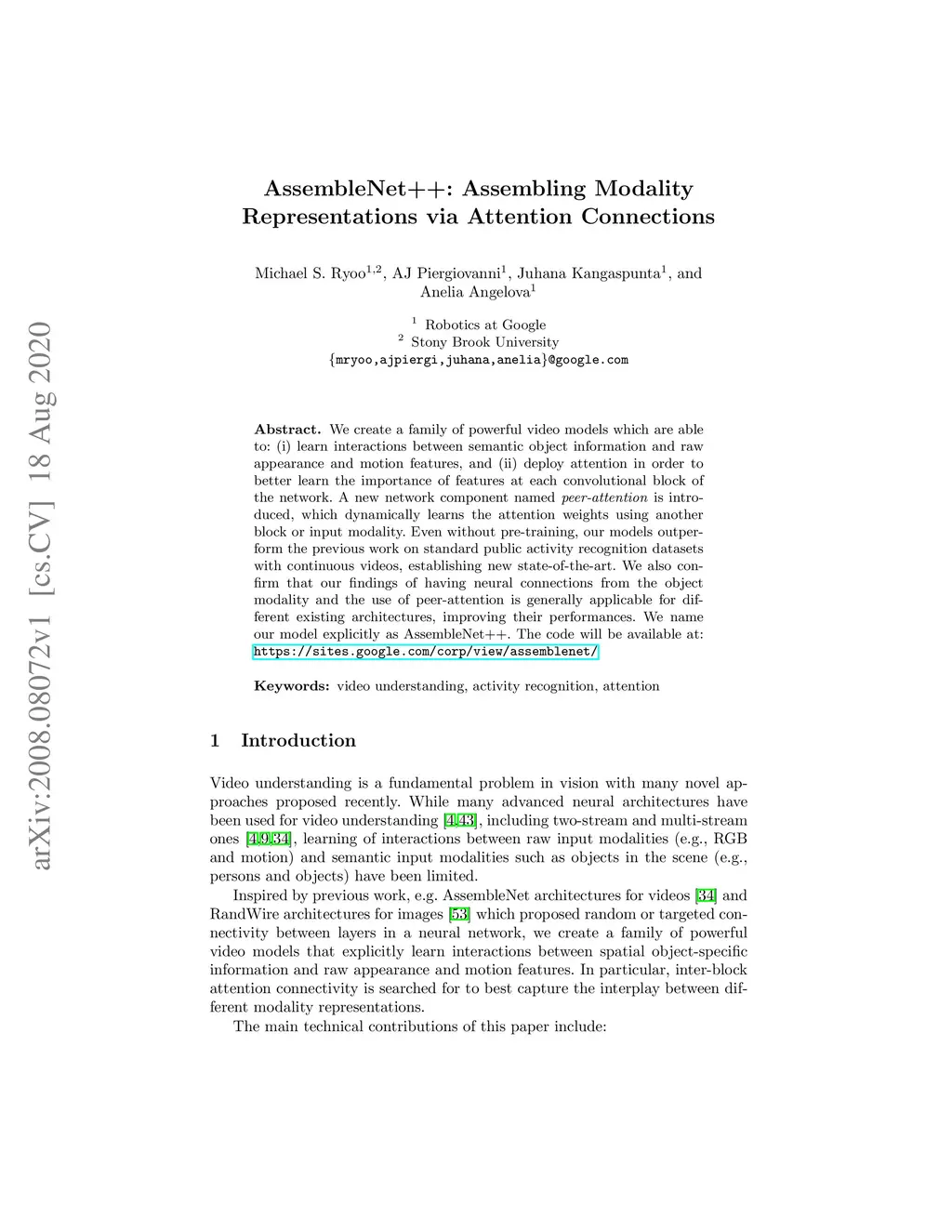 We create a family of powerful video models which are able to: (i) learn interactions between semantic object information and raw appearance and motion features, and (ii) deploy attention in order to better learn the importance of features at each convolutional block of the network. A new network component named peer-attention is introduced, which dynamically learns the attention weights using another block or input modality. Even without pre-training, our models outperform the previous work on standard public activity recognition datasets with continuous videos, establishing new state-of-the-art. We also confirm that our findings of having neural connections from the object modality and the use of peer-attention is generally applicable for different existing architectures, improving their performances. We name our model explicitly as AssembleNet++. The code will be available at: https://sites.google.com/corp/view/assemblenet/