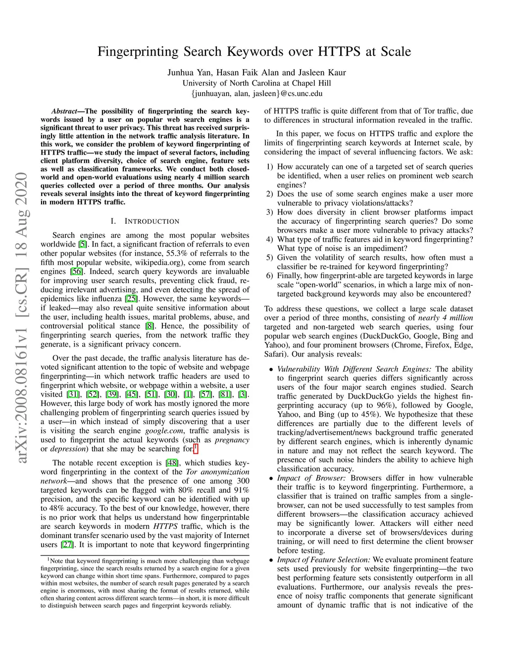 The possibility of fingerprinting the search keywords issued by a user on popular web search engines is a significant threat to user privacy. This threat has received surprisingly little attention in the network traffic analysis literature. In this work, we consider the problem of keyword fingerprinting of HTTPS traffic -- we study the impact of several factors, including client platform diversity, choice of search engine, feature sets as well as classification frameworks. We conduct both closed-world and open-world evaluations using nearly 4 million search queries collected over a period of three months. Our analysis reveals several insights into the threat of keyword fingerprinting in modern HTTPS traffic.