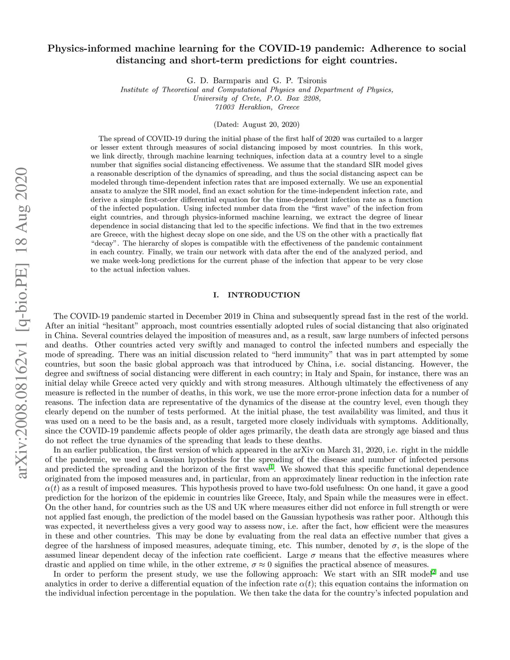 The spread of COVID-19 during the initial phase of the first half of 2020 was curtailed to a larger or lesser extent through measures of social distancing imposed by most countries. In this work, we link directly, through machine learning techniques, infection data at a country level to a single number that signifies social distancing effectiveness. We assume that the standard SIR model gives a reasonable description of the dynamics of spreading, and thus the social distancing aspect can be modeled through time-dependent infection rates that are imposed externally. We use an exponential ansatz to analyze the SIR model, find an exact solution for the time-independent infection rate, and derive a simple first-order differential equation for the time-dependent infection rate as a function of the infected population. Using infected number data from the "first wave" of the infection from eight countries, and through physics-informed machine learning, we extract the degree of linear dependence in social distancing that led to the specific infections. We find that in the two extremes are Greece, with the highest decay slope on one side, and the US on the other with a practically flat "decay". The hierarchy of slopes is compatible with the effectiveness of the pandemic containment in each country. Finally, we train our network with data after the end of the analyzed period, and we make week-long predictions for the current phase of the infection that appear to be very close to the actual infection values.