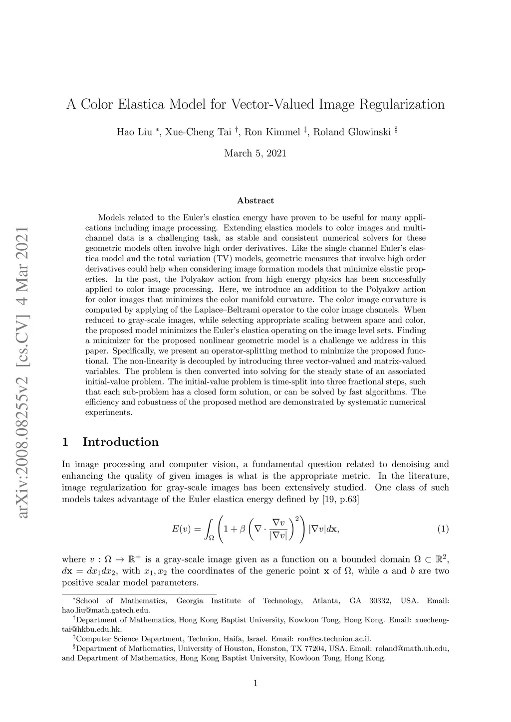 Models related to the Euler's elastica energy have proven to be useful for many applications including image processing. Extending elastica models to color images and multi-channel data is a challenging task, as stable and consistent numerical solvers for these geometric models often involve high order derivatives. Like the single channel Euler's elastica model and the total variation (TV) models, geometric measures that involve high order derivatives could help when considering image formation models that minimize elastic properties. In the past, the Polyakov action from high energy physics has been successfully applied to color image processing. Here, we introduce an addition to the Polyakov action for color images that minimizes the color manifold curvature. The color image curvature is computed by applying of the Laplace-Beltrami operator to the color image channels. When reduced to gray-scale images, while selecting appropriate scaling between space and color, the proposed model minimizes the Euler's elastica operating on the image level sets. Finding a minimizer for the proposed nonlinear geometric model is a challenge we address in this paper. Specifically, we present an operator-splitting method to minimize the proposed functional. The non-linearity is decoupled by introducing three vector-valued and matrix-valued variables. The problem is then converted into solving for the steady state of an associated initial-value problem. The initial-value problem is time-split into three fractional steps, such that each sub-problem has a closed form solution, or can be solved by fast algorithms. The efficiency and robustness of the proposed method are demonstrated by systematic numerical experiments.