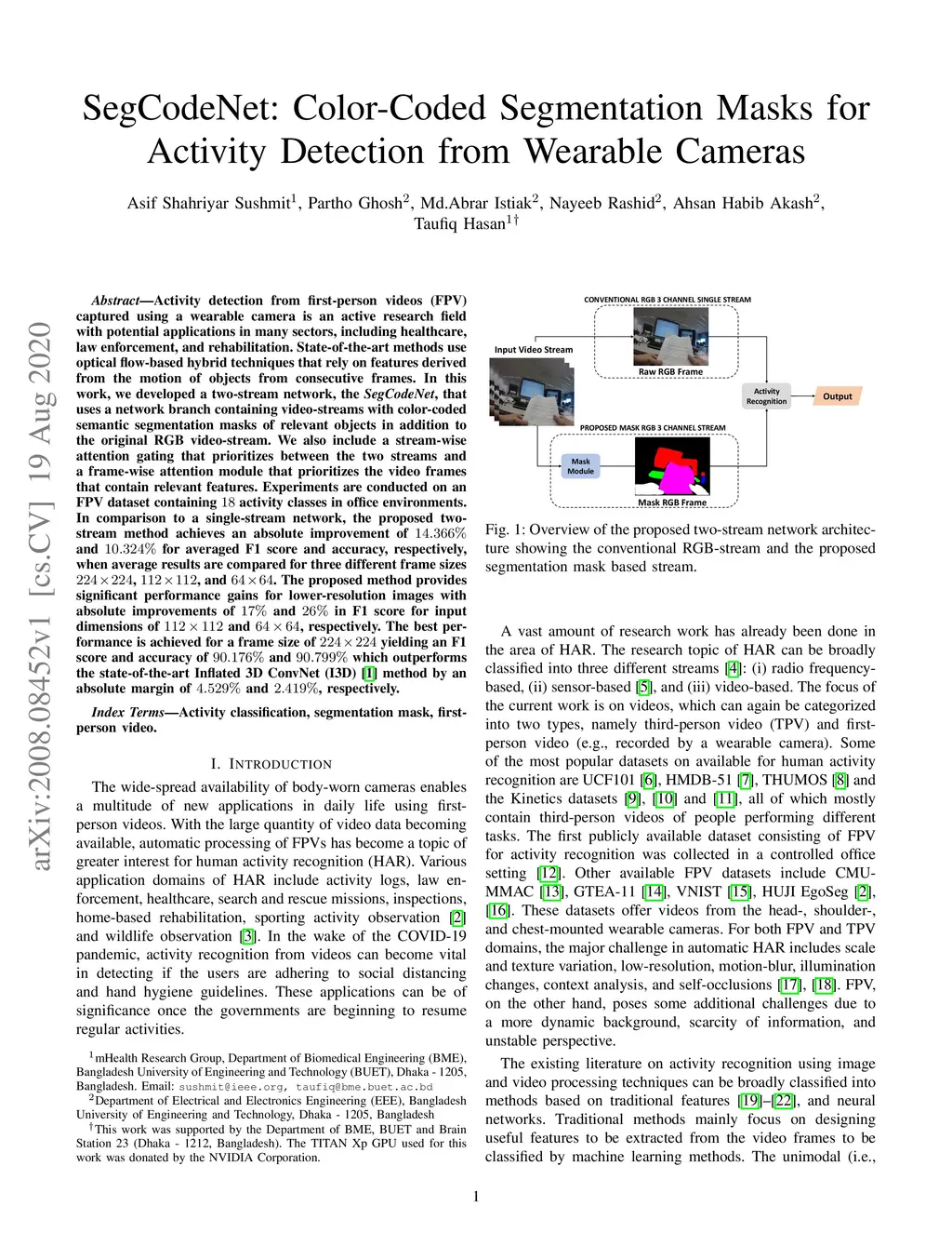 Activity detection from first-person videos (FPV) captured using a wearable camera is an active research field with potential applications in many sectors, including healthcare, law enforcement, and rehabilitation. State-of-the-art methods use optical flow-based hybrid techniques that rely on features derived from the motion of objects from consecutive frames. In this work, we developed a two-stream network, the \emph{SegCodeNet}, that uses a network branch containing video-streams with color-coded semantic segmentation masks of relevant objects in addition to the original RGB video-stream. We also include a stream-wise attention gating that prioritizes between the two streams and a frame-wise attention module that prioritizes the video frames that contain relevant features. Experiments are conducted on an FPV dataset containing activity classes in office environments. In comparison to a single-stream network, the proposed two-stream method achieves an absolute improvement of and for averaged F1 score and accuracy, respectively, when average results are compared for three different frame sizes , , and . The proposed method provides significant performance gains for lower-resolution images with absolute improvements of and in F1 score for input dimensions of and , respectively. The best performance is achieved for a frame size of yielding an F1 score and accuracy of and which outperforms the state-of-the-art Inflated 3D ConvNet (I3D) \cite{carreira2017quo} method by an absolute margin of and , respectively.