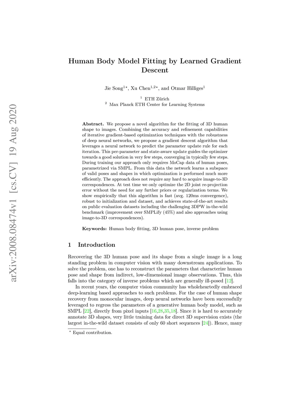 We propose a novel algorithm for the fitting of 3D human shape to images. Combining the accuracy and refinement capabilities of iterative gradient-based optimization techniques with the robustness of deep neural networks, we propose a gradient descent algorithm that leverages a neural network to predict the parameter update rule for each iteration. This per-parameter and state-aware update guides the optimizer towards a good solution in very few steps, converging in typically few steps. During training our approach only requires MoCap data of human poses, parametrized via SMPL. From this data the network learns a subspace of valid poses and shapes in which optimization is performed much more efficiently. The approach does not require any hard to acquire image-to-3D correspondences. At test time we only optimize the 2D joint re-projection error without the need for any further priors or regularization terms. We show empirically that this algorithm is fast (avg. 120ms convergence), robust to initialization and dataset, and achieves state-of-the-art results on public evaluation datasets including the challenging 3DPW in-the-wild benchmark (improvement over SMPLify 45%) and also approaches using image-to-3D correspondences