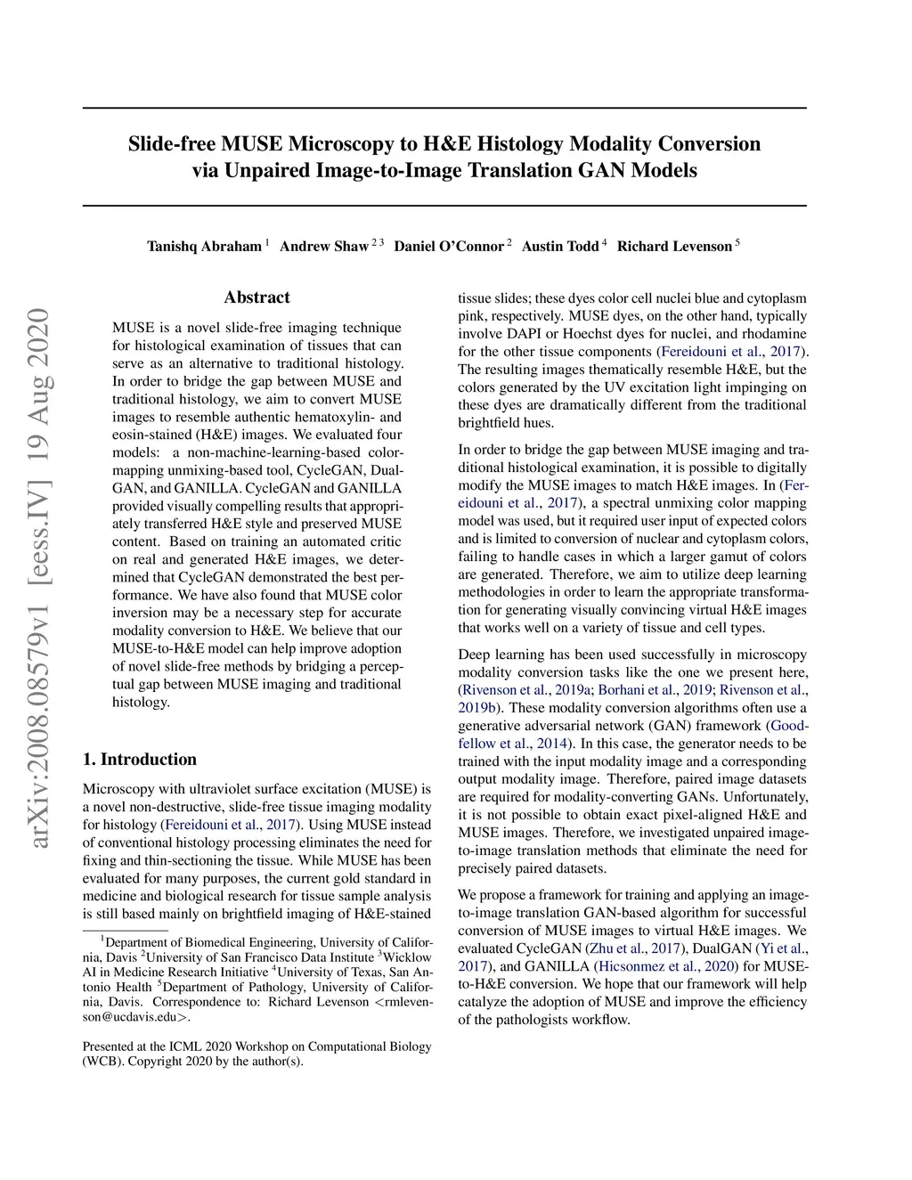 Slide-free MUSE Microscopy to H&E Histology Modality Conversion via