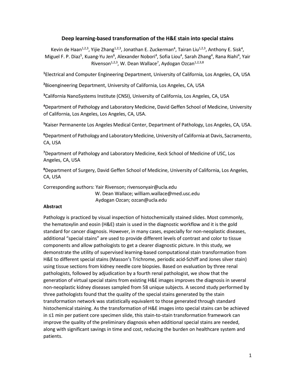 Deep learning-based transformation of the H&E stain into special stains