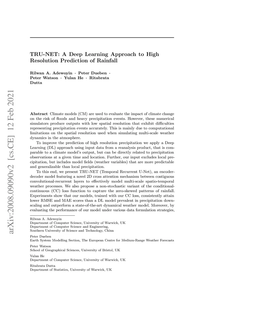Climate models (CM) are used to evaluate the impact of climate change on the risk of floods and strong precipitation events. However, these numerical simulators have difficulties representing precipitation events accurately, mainly due to limited spatial resolution when simulating multi-scale dynamics in the atmosphere. To improve the prediction of high resolution precipitation we apply a Deep Learning (DL) approach using an input of CM simulations of the model fields (weather variables) that are more predictable than local precipitation. To this end, we present TRU-NET (Temporal Recurrent U-Net), an encoder-decoder model featuring a novel 2D cross attention mechanism between contiguous convolutional-recurrent layers to effectively model multi-scale spatio-temporal weather processes. We use a conditional-continuous loss function to capture the zero-skewed %extreme event patterns of rainfall. Experiments show that our model consistently attains lower RMSE and MAE scores than a DL model prevalent in short term precipitation prediction and improves upon the rainfall predictions of a state-of-the-art dynamical weather model. Moreover, by evaluating the performance of our model under various, training and testing, data formulation strategies, we show that there is enough data for our deep learning approach to output robust, high-quality results across seasons and varying regions.
