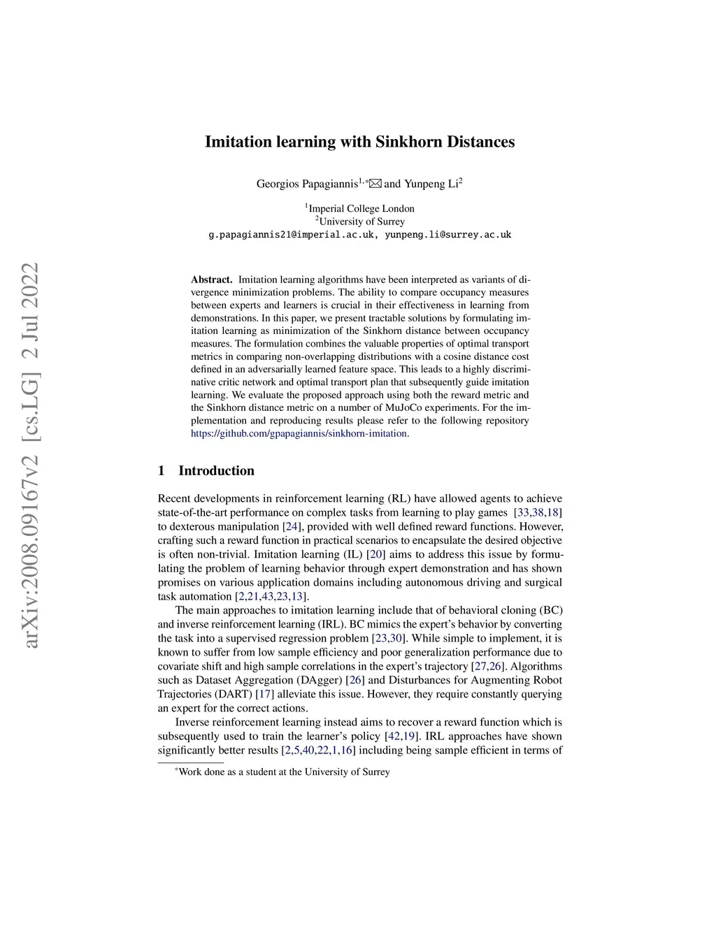 Imitation learning algorithms have been interpreted as variants of divergence minimization problems. The ability to compare occupancy measures between experts and learners is crucial in their effectiveness in learning from demonstrations. In this paper, we present tractable solutions by formulating imitation learning as minimization of the Sinkhorn distance between occupancy measures. The formulation combines the valuable properties of optimal transport metrics in comparing non-overlapping distributions with a cosine distance cost defined in an adversarially learned feature space. This leads to a highly discriminative critic network and optimal transport plan that subsequently guide imitation learning. We evaluate the proposed approach using both the reward metric and the Sinkhorn distance metric on a number of MuJoCo experiments. For the implementation and reproducing results please refer to the following repository https://github.com/gpapagiannis/sinkhorn-imitation.