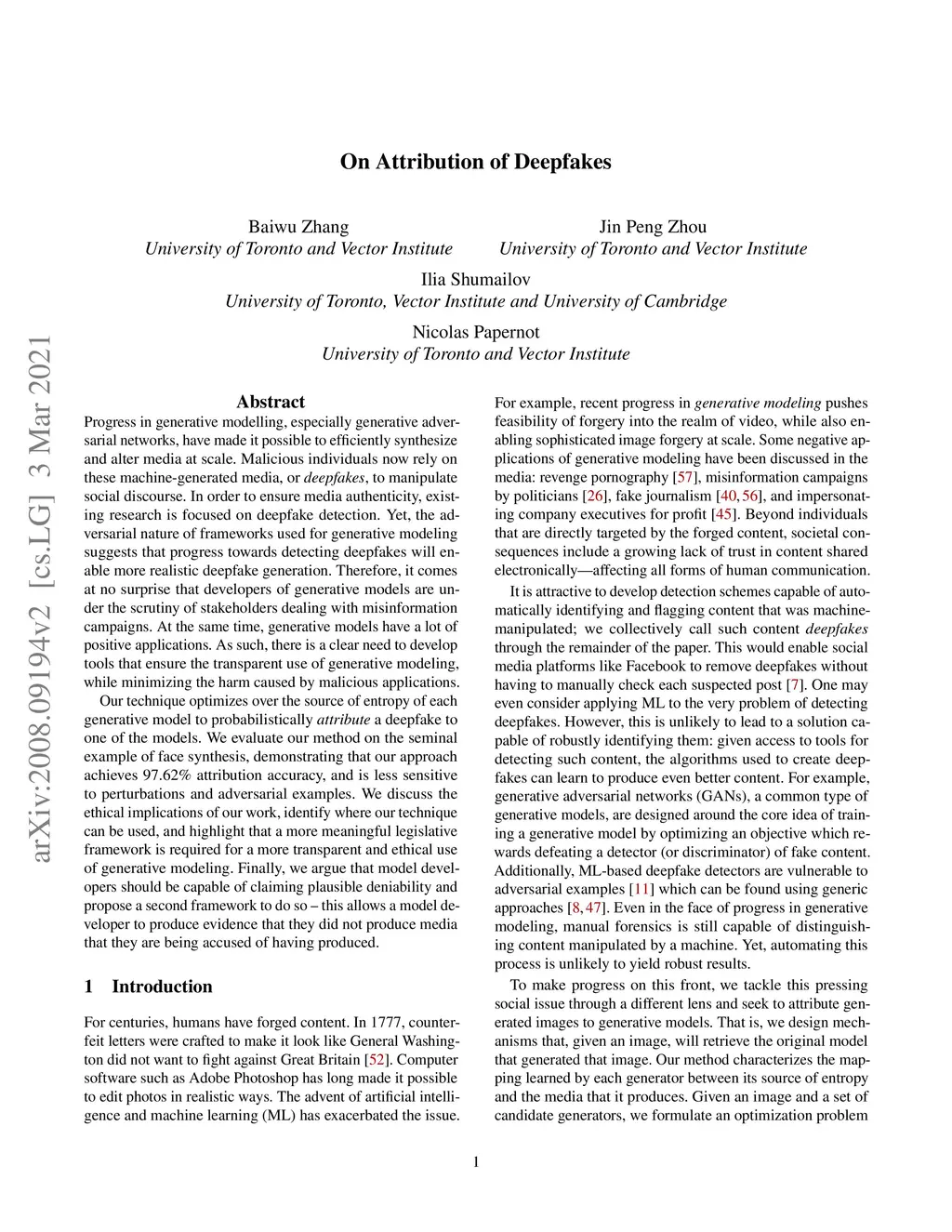 Progress in generative modelling, especially generative adversarial networks, have made it possible to efficiently synthesize and alter media at scale. Malicious individuals now rely on these machine-generated media, or deepfakes, to manipulate social discourse. In order to ensure media authenticity, existing research is focused on deepfake detection. Yet, the adversarial nature of frameworks used for generative modeling suggests that progress towards detecting deepfakes will enable more realistic deepfake generation. Therefore, it comes at no surprise that developers of generative models are under the scrutiny of stakeholders dealing with misinformation campaigns. At the same time, generative models have a lot of positive applications. As such, there is a clear need to develop tools that ensure the transparent use of generative modeling, while minimizing the harm caused by malicious applications. Our technique optimizes over the source of entropy of each generative model to probabilistically attribute a deepfake to one of the models. We evaluate our method on the seminal example of face synthesis, demonstrating that our approach achieves 97.62% attribution accuracy, and is less sensitive to perturbations and adversarial examples. We discuss the ethical implications of our work, identify where our technique can be used, and highlight that a more meaningful legislative framework is required for a more transparent and ethical use of generative modeling. Finally, we argue that model developers should be capable of claiming plausible deniability and propose a second framework to do so -- this allows a model developer to produce evidence that they did not produce media that they are being accused of having produced.