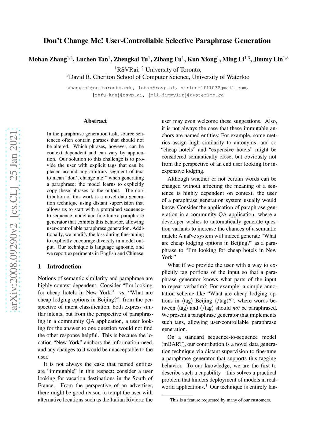 In the paraphrase generation task, source sentences often contain phrases that should not be altered. Which phrases, however, can be context dependent and can vary by application. Our solution to this challenge is to provide the user with explicit tags that can be placed around any arbitrary segment of text to mean "don't change me!" when generating a paraphrase; the model learns to explicitly copy these phrases to the output. The contribution of this work is a novel data generation technique using distant supervision that allows us to start with a pretrained sequence-to-sequence model and fine-tune a paraphrase generator that exhibits this behavior, allowing user-controllable paraphrase generation. Additionally, we modify the loss during fine-tuning to explicitly encourage diversity in model output. Our technique is language agnostic, and we report experiments in English and Chinese.