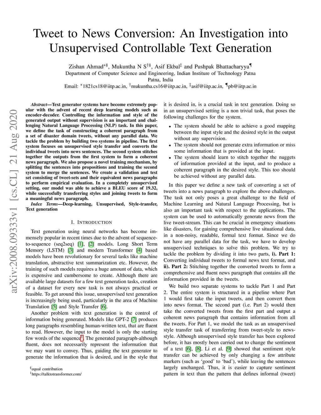 Text generator systems have become extremely popular with the advent of recent deep learning models such as encoder-decoder. Controlling the information and style of the generated output without supervision is an important and challenging Natural Language Processing (NLP) task. In this paper, we define the task of constructing a coherent paragraph from a set of disaster domain tweets, without any parallel data. We tackle the problem by building two systems in pipeline. The first system focuses on unsupervised style transfer and converts the individual tweets into news sentences. The second system stitches together the outputs from the first system to form a coherent news paragraph. We also propose a novel training mechanism, by splitting the sentences into propositions and training the second system to merge the sentences. We create a validation and test set consisting of tweet-sets and their equivalent news paragraphs to perform empirical evaluation. In a completely unsupervised setting, our model was able to achieve a BLEU score of 19.32, while successfully transferring styles and joining tweets to form a meaningful news paragraph.
