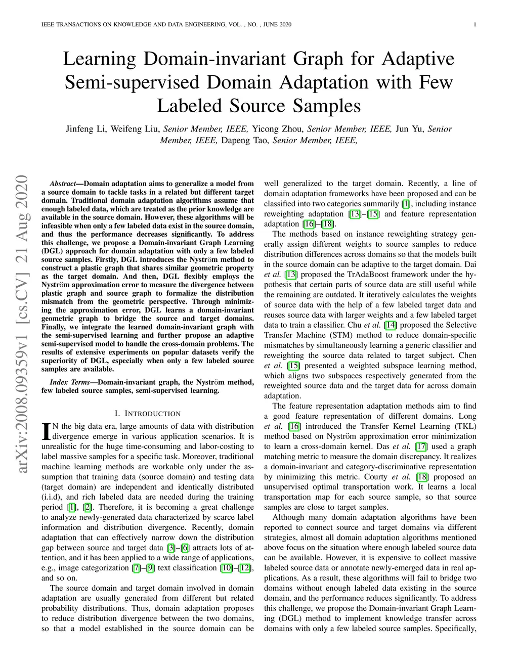 Domain adaptation aims to generalize a model from a source domain to tackle tasks in a related but different target domain. Traditional domain adaptation algorithms assume that enough labeled data, which are treated as the prior knowledge are available in the source domain. However, these algorithms will be infeasible when only a few labeled data exist in the source domain, and thus the performance decreases significantly. To address this challenge, we propose a Domain-invariant Graph Learning (DGL) approach for domain adaptation with only a few labeled source samples. Firstly, DGL introduces the Nystrom method to construct a plastic graph that shares similar geometric property as the target domain. And then, DGL flexibly employs the Nystrom approximation error to measure the divergence between plastic graph and source graph to formalize the distribution mismatch from the geometric perspective. Through minimizing the approximation error, DGL learns a domain-invariant geometric graph to bridge source and target domains. Finally, we integrate the learned domain-invariant graph with the semi-supervised learning and further propose an adaptive semi-supervised model to handle the cross-domain problems. The results of extensive experiments on popular datasets verify the superiority of DGL, especially when only a few labeled source samples are available.