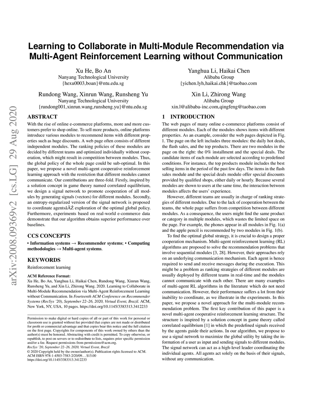 With the rise of online e-commerce platforms, more and more customers prefer to shop online. To sell more products, online platforms introduce various modules to recommend items with different properties such as huge discounts. A web page often consists of different independent modules. The ranking policies of these modules are decided by different teams and optimized individually without cooperation, which might result in competition between modules. Thus, the global policy of the whole page could be sub-optimal. In this paper, we propose a novel multi-agent cooperative reinforcement learning approach with the restriction that different modules cannot communicate. Our contributions are three-fold. Firstly, inspired by a solution concept in game theory named correlated equilibrium, we design a signal network to promote cooperation of all modules by generating signals (vectors) for different modules. Secondly, an entropy-regularized version of the signal network is proposed to coordinate agents' exploration of the optimal global policy. Furthermore, experiments based on real-world e-commerce data demonstrate that our algorithm obtains superior performance over baselines.