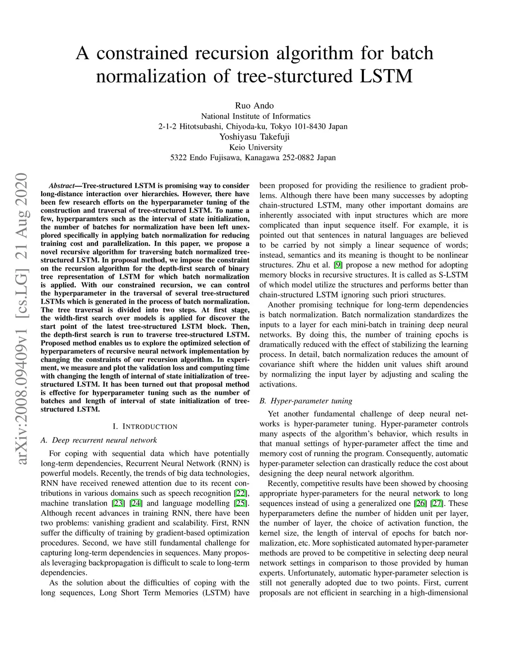 Tree-structured LSTM is promising way to consider long-distance interaction over hierarchies. However, there have been few research efforts on the hyperparameter tuning of the construction and traversal of tree-structured LSTM. To name a few, hyperparamters such as the interval of state initialization, the number of batches for normalization have been left unexplored specifically in applying batch normalization for reducing training cost and parallelization. In this paper, we propose a novel recursive algorithm for traversing batch normalized tree-structured LSTM. In proposal method, we impose the constraint on the recursion algorithm for the depth-first search of binary tree representation of LSTM for which batch normalization is applied. With our constrained recursion, we can control the hyperparameter in the traversal of several tree-structured LSTMs which is generated in the process of batch normalization. The tree traversal is divided into two steps. At first stage, the width-first search over models is applied for discover the start point of the latest tree-structured LSTM block. Then, the depth-first search is run to traverse tree-structured LSTM. Proposed method enables us to explore the optimized selection of hyperparameters of recursive neural network implementation by changing the constraints of our recursion algorithm. In experiment, we measure and plot the validation loss and computing time with changing the length of internal of state initialization of tree-structured LSTM. It has been turned out that proposal method is effective for hyperparameter tuning such as the number of batches and length of interval of state initialization of tree-structured LSTM.