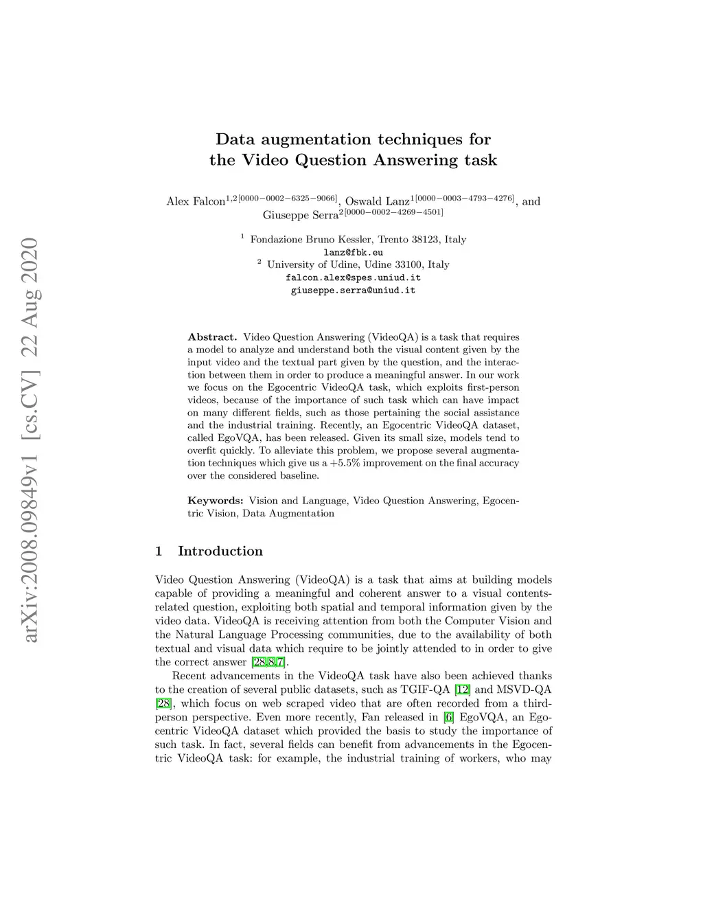 Video Question Answering (VideoQA) is a task that requires a model to analyze and understand both the visual content given by the input video and the textual part given by the question, and the interaction between them in order to produce a meaningful answer. In our work we focus on the Egocentric VideoQA task, which exploits first-person videos, because of the importance of such task which can have impact on many different fields, such as those pertaining the social assistance and the industrial training. Recently, an Egocentric VideoQA dataset, called EgoVQA, has been released. Given its small size, models tend to overfit quickly. To alleviate this problem, we propose several augmentation techniques which give us a +5.5% improvement on the final accuracy over the considered baseline.