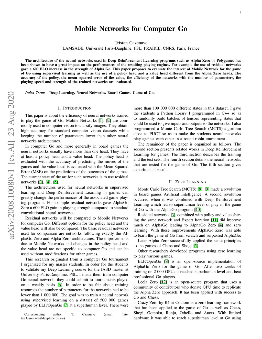 The architecture of the neural networks used in Deep Reinforcement Learning programs such as Alpha Zero or Polygames has been shown to have a great impact on the performances of the resulting playing engines. For example the use of residual networks gave a 600 ELO increase in the strength of Alpha Go. This paper proposes to evaluate the interest of Mobile Network for the game of Go using supervised learning as well as the use of a policy head and a value head different from the Alpha Zero heads. The accuracy of the policy, the mean squared error of the value, the efficiency of the networks with the number of parameters, the playing speed and strength of the trained networks are evaluated.