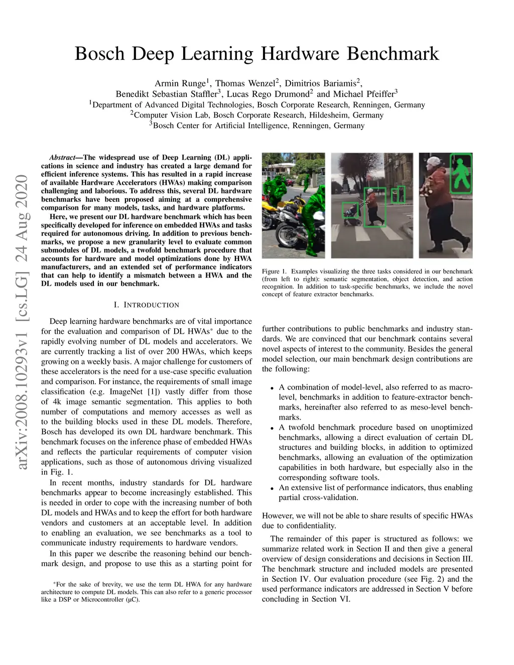 The widespread use of Deep Learning (DL) applications in science and industry has created a large demand for efficient inference systems. This has resulted in a rapid increase of available Hardware Accelerators (HWAs) making comparison challenging and laborious. To address this, several DL hardware benchmarks have been proposed aiming at a comprehensive comparison for many models, tasks, and hardware platforms. Here, we present our DL hardware benchmark which has been specifically developed for inference on embedded HWAs and tasks required for autonomous driving. In addition to previous benchmarks, we propose a new granularity level to evaluate common submodules of DL models, a twofold benchmark procedure that accounts for hardware and model optimizations done by HWA manufacturers, and an extended set of performance indicators that can help to identify a mismatch between a HWA and the DL models used in our benchmark.