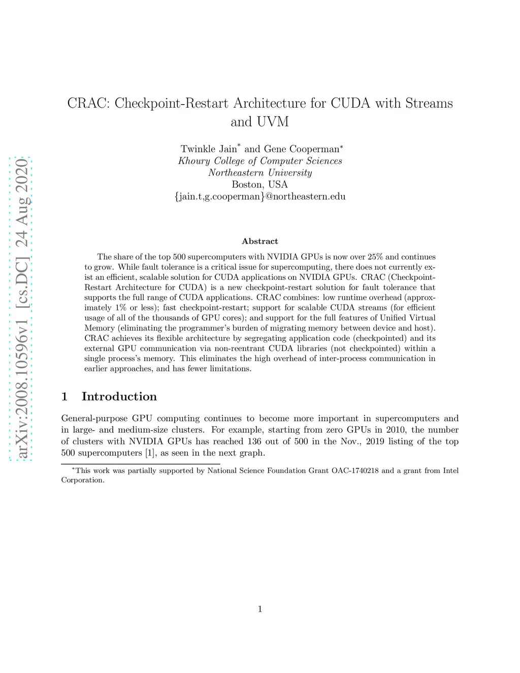 The share of the top 500 supercomputers with NVIDIA GPUs is now over 25% and continues to grow. While fault tolerance is a critical issue for supercomputing, there does not currently exist an efficient, scalable solution for CUDA applications on NVIDIA GPUs. CRAC (Checkpoint-Restart Architecture for CUDA) is new checkpoint-restart solution for fault tolerance that supports the full range of CUDA applications. CRAC combines: low runtime overhead (approximately 1% or less); fast checkpoint-restart; support for scalable CUDA streams (for efficient usage of all of the thousands of GPU cores); and support for the full features of Unified Virtual Memory (eliminating the programmer's burden of migrating memory between device and host). CRAC achieves its flexible architecture by segregating application code (checkpointed) and its external GPU communication via non-reentrant CUDA libraries (not checkpointed) within a single process's memory. This eliminates the high overhead of inter-process communication in earlier approaches, and has fewer limitations.
