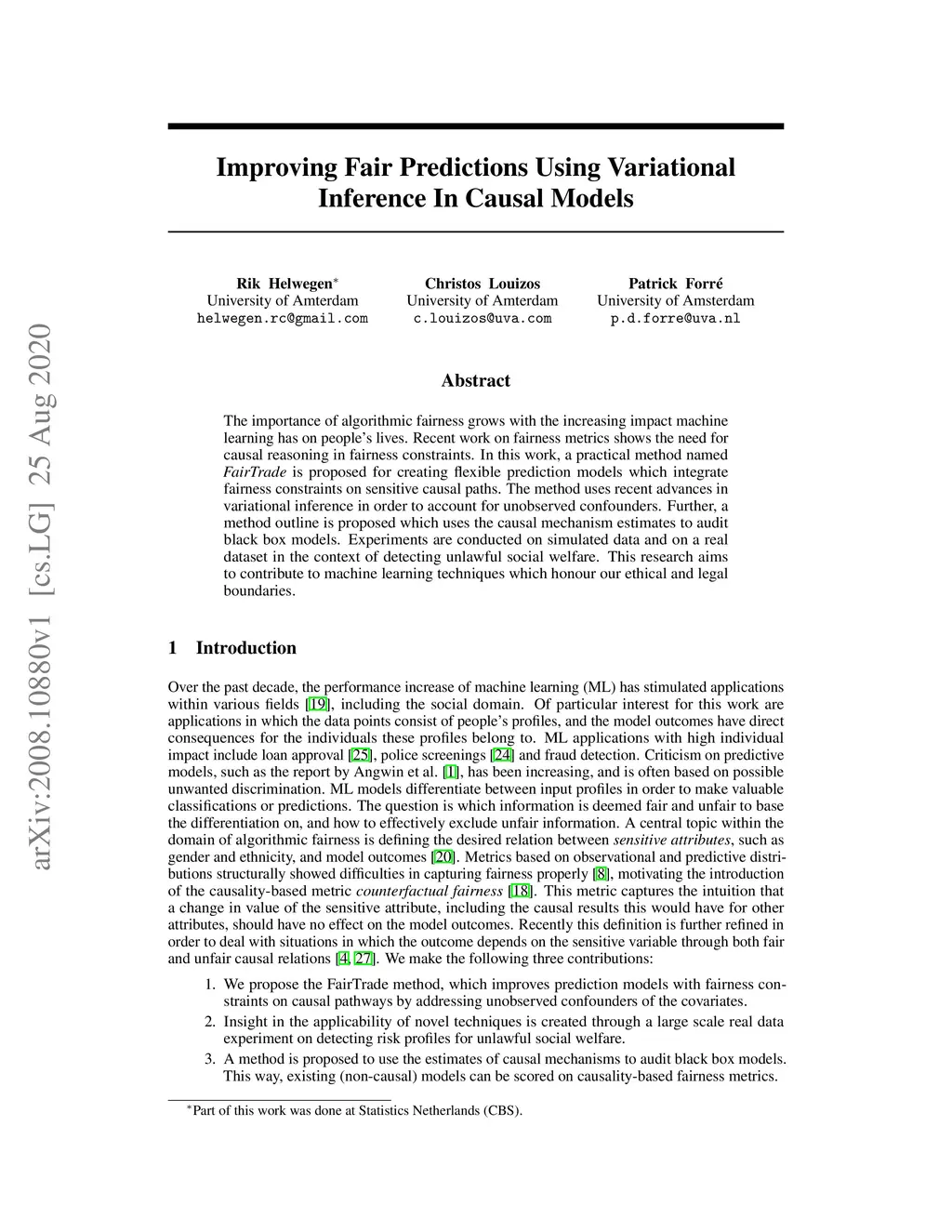 The importance of algorithmic fairness grows with the increasing impact machine learning has on people's lives. Recent work on fairness metrics shows the need for causal reasoning in fairness constraints. In this work, a practical method named FairTrade is proposed for creating flexible prediction models which integrate fairness constraints on sensitive causal paths. The method uses recent advances in variational inference in order to account for unobserved confounders. Further, a method outline is proposed which uses the causal mechanism estimates to audit black box models. Experiments are conducted on simulated data and on a real dataset in the context of detecting unlawful social welfare. This research aims to contribute to machine learning techniques which honour our ethical and legal boundaries.