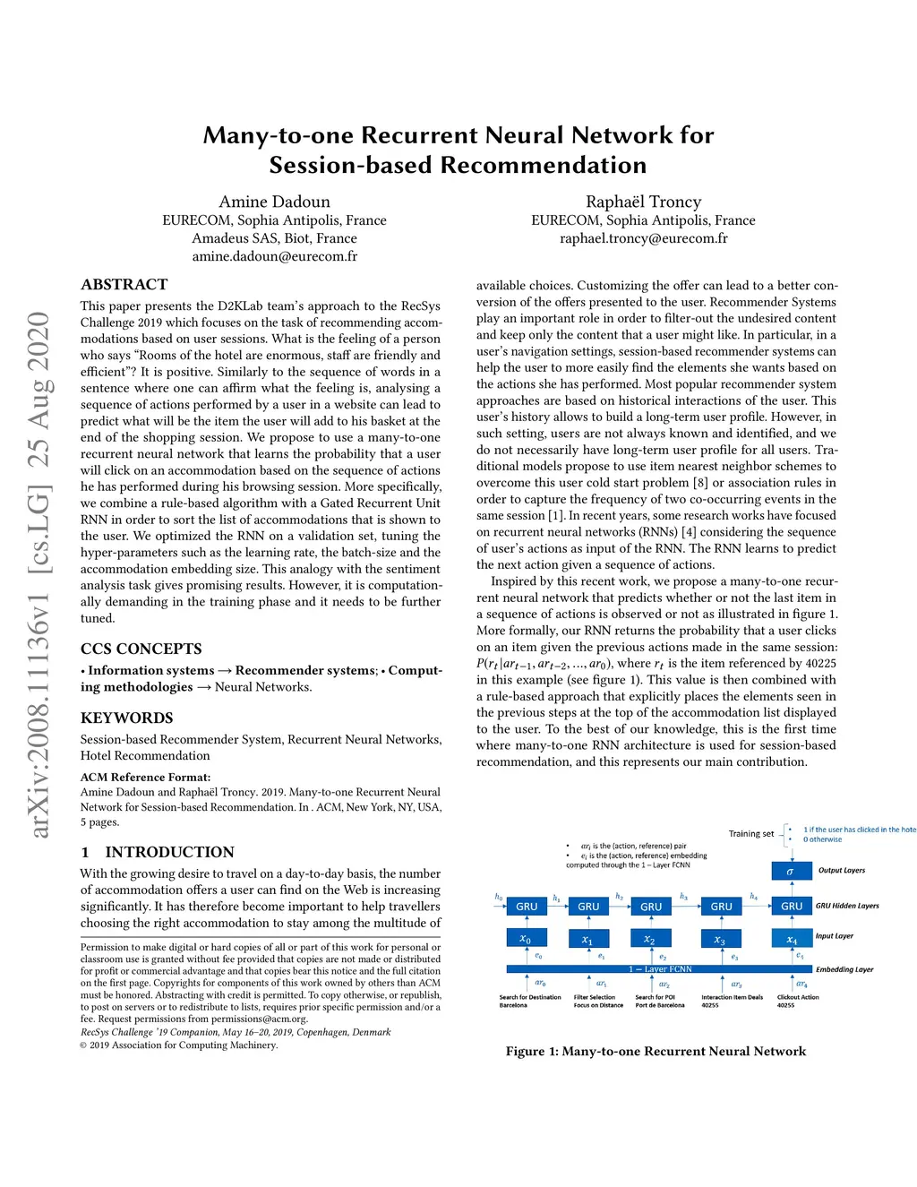 This paper presents the D2KLab team's approach to the RecSys Challenge 2019 which focuses on the task of recommending accommodations based on user sessions. What is the feeling of a person who says "Rooms of the hotel are enormous, staff are friendly and efficient"? It is positive. Similarly to the sequence of words in a sentence where one can affirm what the feeling is, analysing a sequence of actions performed by a user in a website can lead to predict what will be the item the user will add to his basket at the end of the shopping session. We propose to use a many-to-one recurrent neural network that learns the probability that a user will click on an accommodation based on the sequence of actions he has performed during his browsing session. More specifically, we combine a rule-based algorithm with a Gated Recurrent Unit RNN in order to sort the list of accommodations that is shown to the user. We optimized the RNN on a validation set, tuning the hyper-parameters such as the learning rate, the batch-size and the accommodation embedding size. This analogy with the sentiment analysis task gives promising results. However, it is computationally demanding in the training phase and it needs to be further tuned.