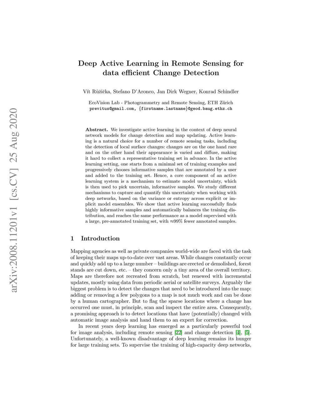 We investigate active learning in the context of deep neural network models for change detection and map updating. Active learning is a natural choice for a number of remote sensing tasks, including the detection of local surface changes: changes are on the one hand rare and on the other hand their appearance is varied and diffuse, making it hard to collect a representative training set in advance. In the active learning setting, one starts from a minimal set of training examples and progressively chooses informative samples that are annotated by a user and added to the training set. Hence, a core component of an active learning system is a mechanism to estimate model uncertainty, which is then used to pick uncertain, informative samples. We study different mechanisms to capture and quantify this uncertainty when working with deep networks, based on the variance or entropy across explicit or implicit model ensembles. We show that active learning successfully finds highly informative samples and automatically balances the training distribution, and reaches the same performance as a model supervised with a large, pre-annotated training set, with 99% fewer annotated samples.