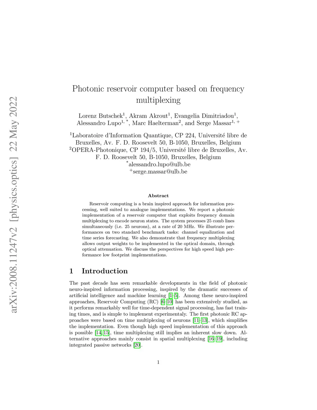 Reservoir computing is a brain inspired approach for information processing, well suited to analogue implementations. We report a photonic implementation of a reservoir computer that exploits frequency domain multiplexing to encode neuron states. The system processes 25 comb lines simultaneously (i.e. 25 neurons), at a rate of 20 MHz. We illustrate performances on two standard benchmark tasks: channel equalization and time series forecasting. We also demonstrate that frequency multiplexing allows output weights to be implemented in the optical domain, through optical attenuation. We discuss the perspectives for high speed high performance low footprint implementations.