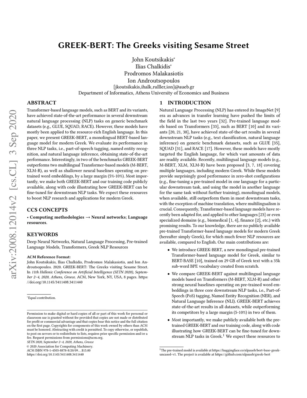 Transformer-based language models, such as BERT and its variants, have achieved state-of-the-art performance in several downstream natural language processing (NLP) tasks on generic benchmark datasets (e.g., GLUE, SQUAD, RACE). However, these models have mostly been applied to the resource-rich English language. In this paper, we present GREEK-BERT, a monolingual BERT-based language model for modern Greek. We evaluate its performance in three NLP tasks, i.e., part-of-speech tagging, named entity recognition, and natural language inference, obtaining state-of-the-art performance. Interestingly, in two of the benchmarks GREEK-BERT outperforms two multilingual Transformer-based models (M-BERT, XLM-R), as well as shallower neural baselines operating on pre-trained word embeddings, by a large margin (5%-10%). Most importantly, we make both GREEK-BERT and our training code publicly available, along with code illustrating how GREEK-BERT can be fine-tuned for downstream NLP tasks. We expect these resources to boost NLP research and applications for modern Greek.