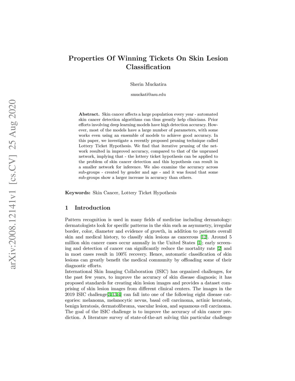 Skin cancer affects a large population every year -- automated skin cancer detection algorithms can thus greatly help clinicians. Prior efforts involving deep learning models have high detection accuracy. However, most of the models have a large number of parameters, with some works even using an ensemble of models to achieve good accuracy. In this paper, we investigate a recently proposed pruning technique called Lottery Ticket Hypothesis. We find that iterative pruning of the network resulted in improved accuracy, compared to that of the unpruned network, implying that -- the lottery ticket hypothesis can be applied to the problem of skin cancer detection and this hypothesis can result in a smaller network for inference. We also examine the accuracy across sub-groups -- created by gender and age -- and it was found that some sub-groups show a larger increase in accuracy than others.